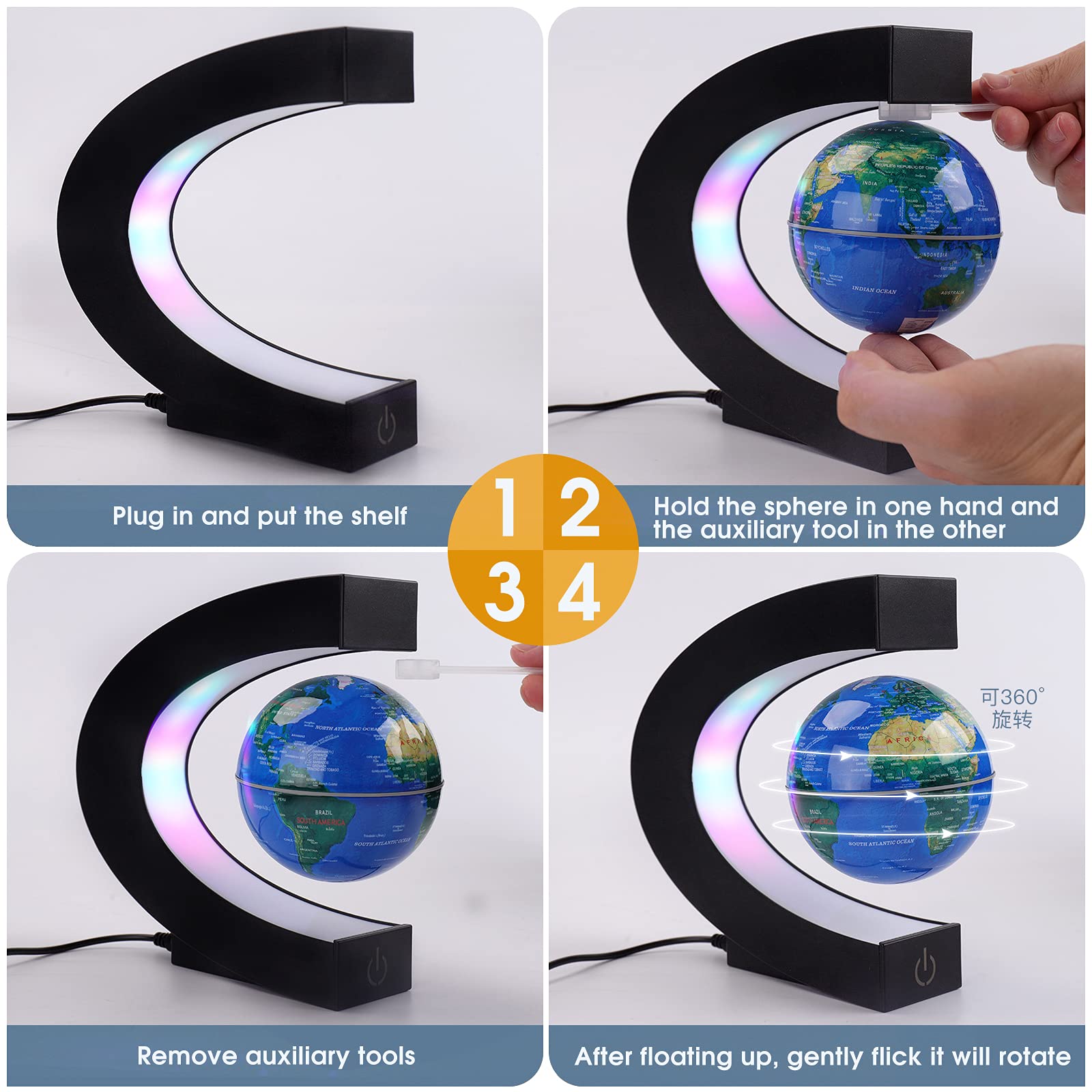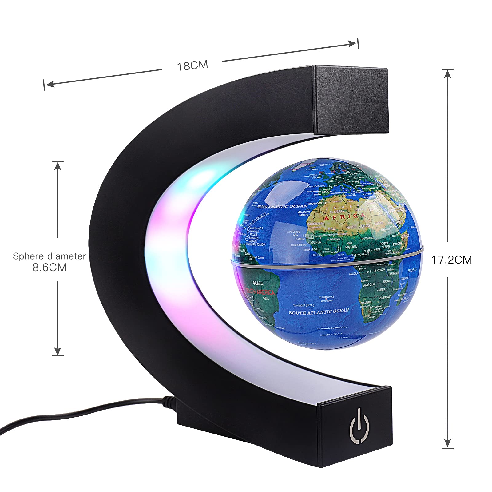 - DESIGN: C-Form (H * B): 6,81 Zoll x 7,09 Zoll, Es gibt drei Farben des optionalen Globus, blau, schwarz, gold, mit bunten LED-Lichtern, damit der Globus nachts schöner aussieht.