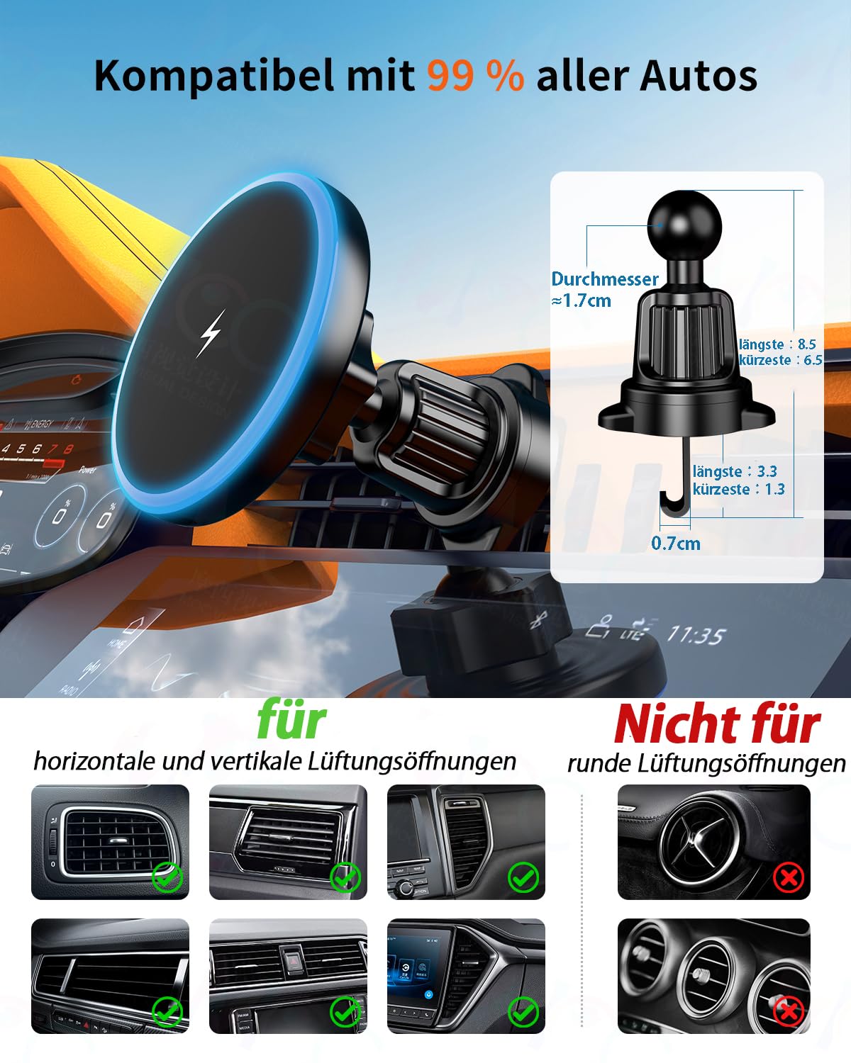 - Magsafe halterung fürs auto wird über dem Auslass der Klimaanlage installiert: Der stabile Kugelkopf lässt sich flexibel um verstellen und die „Adlerkralle“-Klemme bleibt auch auf holprigen Straßen stabil. Kompakt und einfach zu installieren, induktive ladestation mit 20 leistungsstarken Magneten mit einer maximalen Magnetkraft von 1999 g ausgestattet. Es kann verhindern, dass Ihr Telefon herunterfällt, und sorgt für sicheres Fahren auch auf unebenen Straßen