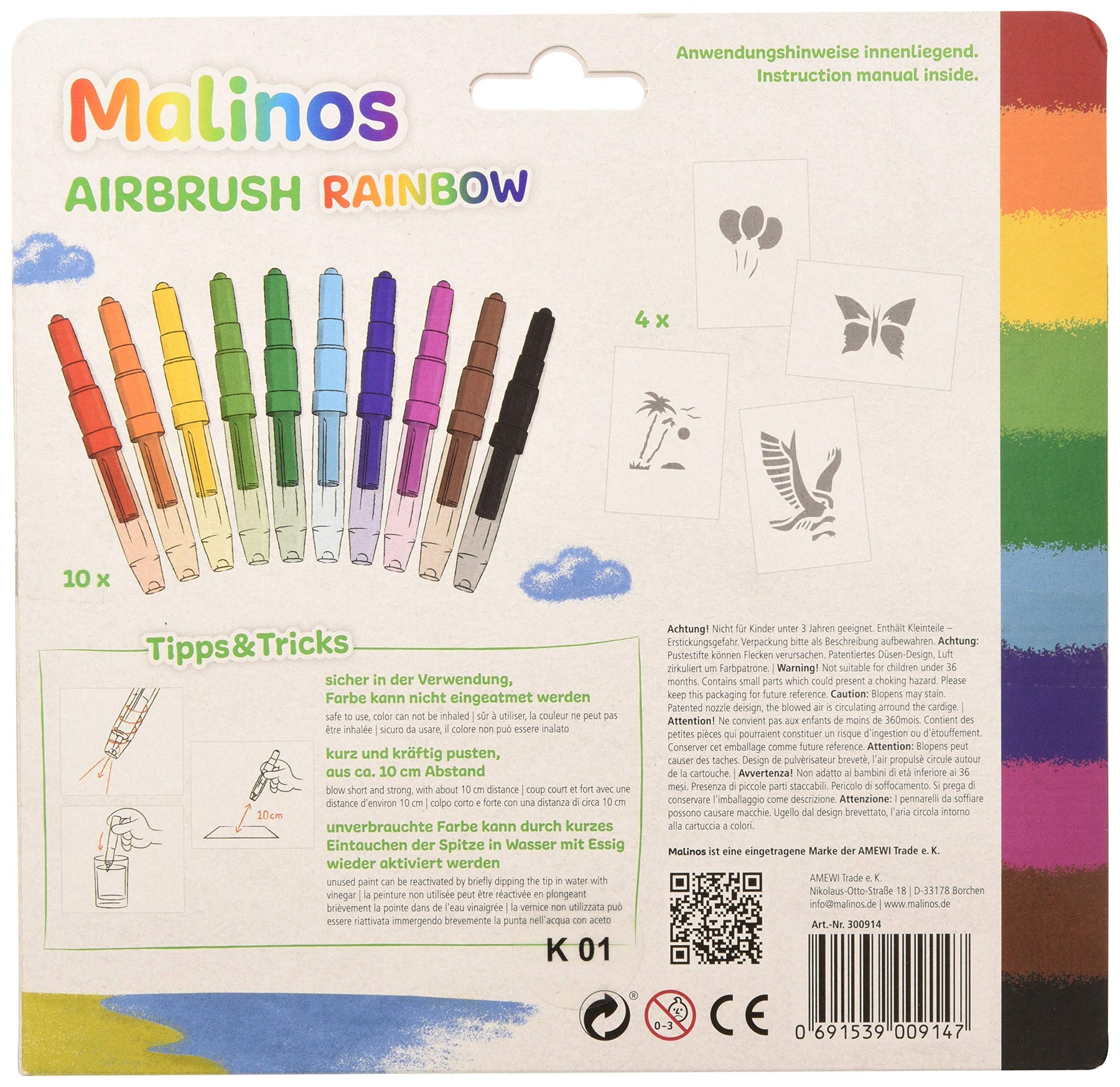 Einzelheiten: Airbrush Stifte Rainbow sind der ultimative Airbrus-Spaß für Kinder und Erwachsene Oben in die Stifte hineinpusten - und unten kommt die Farbe raus Mit den vier beiliegenden Schablonen entstehen ganz schnell kleine und große Kunstwerke Die Pustestifte überzeugen durch ihre kräftigen Farben und der einfachen Anwendung Durch den hochwertigen Kunststoff wird das Diffundierenverhindert Für Kinder ab 5 Jahren geeignet Ein versehentliches Inhalieren der Farbe ist durcheine Sicherheitsmembran unmöglich Tip Mit Wasser und Essig kann die unverbrauchteFarbe wieder aktiviert werden Inhalt 4 Schablonen DIN A510 farbige Airbrush Stifte