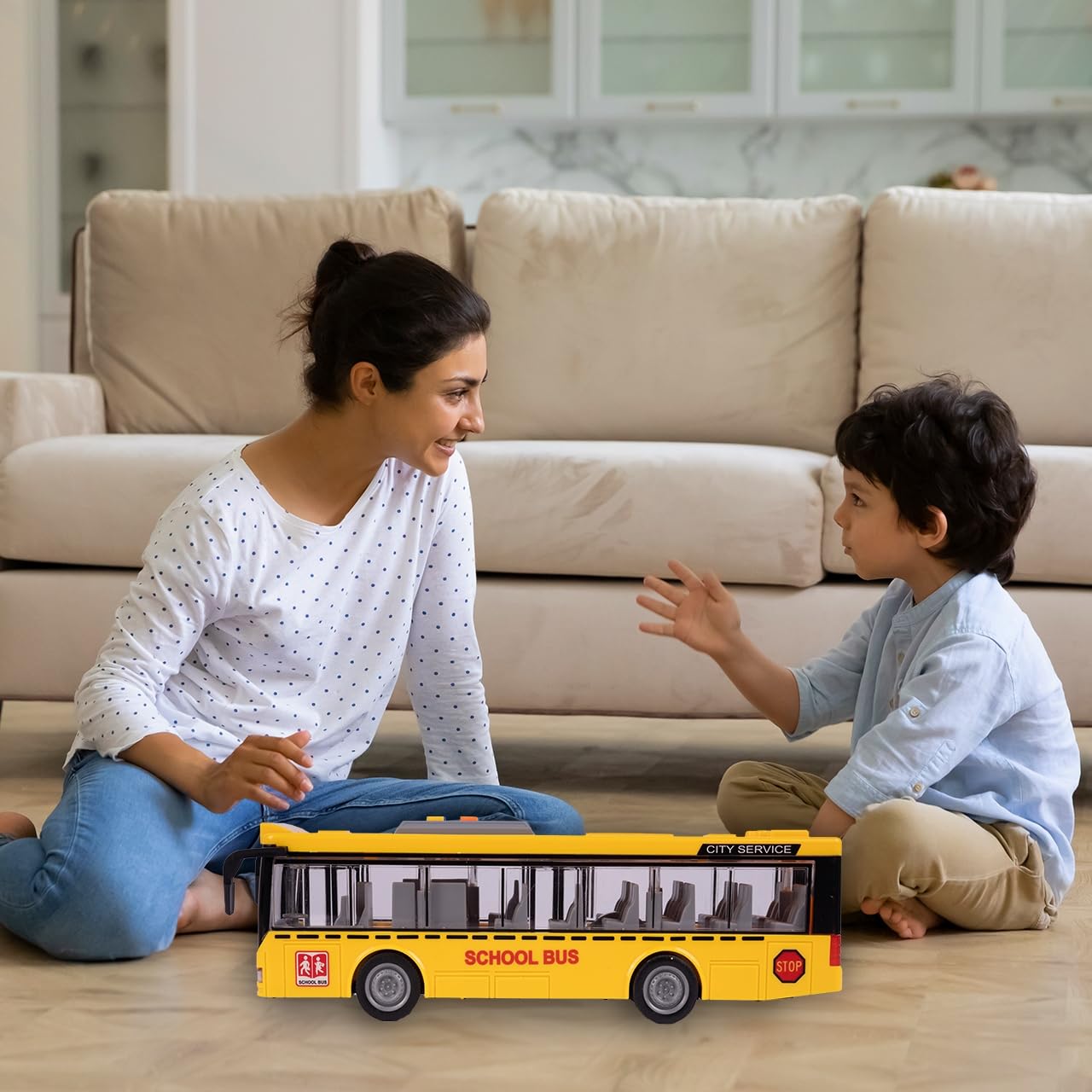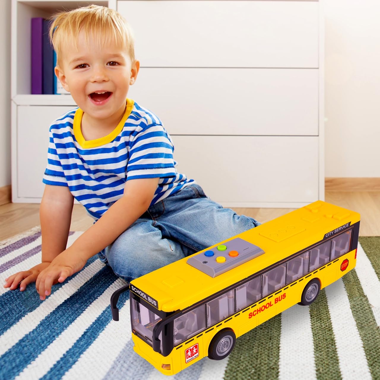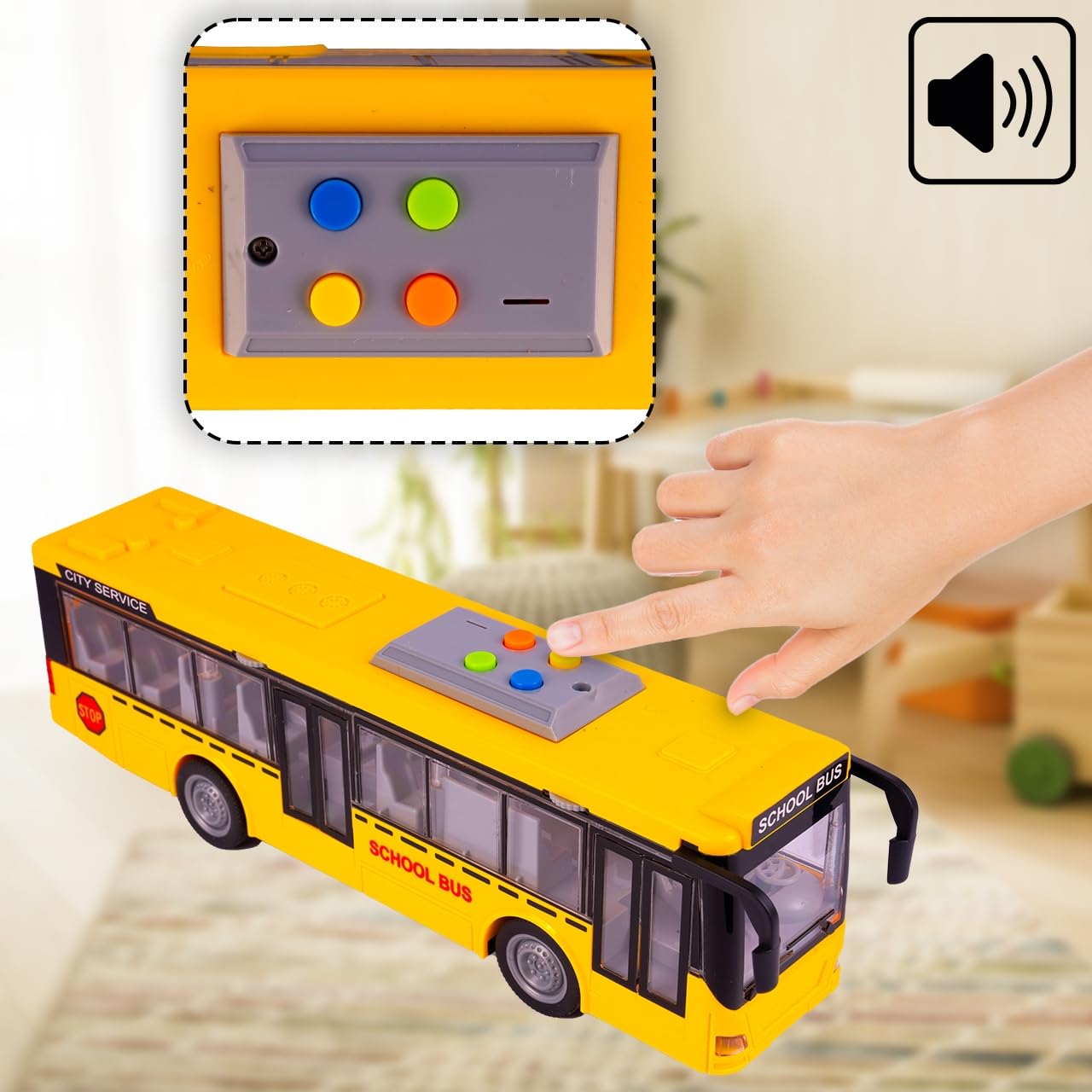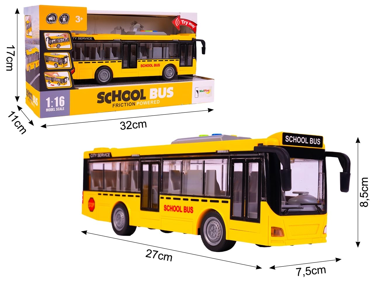 Die Bustüren können geöffnet werden! Dank spezieller Schieberegler lassen sie sich schnell öffnen und schließen. Wie in einem echten Bus kann man etwas hineinlegen und transportieren! HAUPTMERKMALE UND VORTEILE DES SPIELZEUGS: Spielzeug im Maßstab 1:16 Schulbus vier Knöpfe auf dem Dach machen vier verschiedene Geräusche der Innenraum ist blau beleuchtet 2 Paar zu öffnende Türen wie beim echten Fahrzeug realistische Nachbildung eines Stadtfahrzeugs Gummiräder machen es einfach, den Bus zu beschleunigen batteriebetrieben - Batterien enthalten