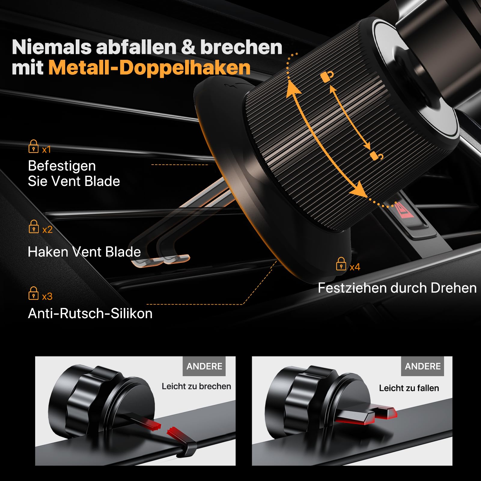 - 【METALL-DOPPELHAKEN-DESIGN, SICHERER HALT】Miracase Handyhalterung Auto verfügt über ein Metall-Doppelhaken-Design, das den Druck gleichmäßig auf die Lüftungsschlitze des Fahrzeugs verteilt und selbst auf unebenen Straßen einen festen Halt bietet. Hinweis: Geeignet für horizontale und vertikale Lüftungsöffnungen. Nicht kompatibel mit runden Lüftungsöffnungen.