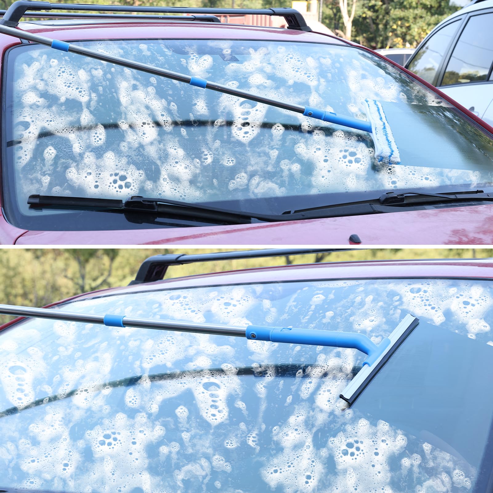 - Multifunktional: Mit dem Rakel Set und dem Mikrofaserwischer lassen sich niedrige Stellen wie die Tür des Duschspiegels reinigen. Mit den Stangen können auch hohe Fenster und Autoscheiben gereinigt werden.