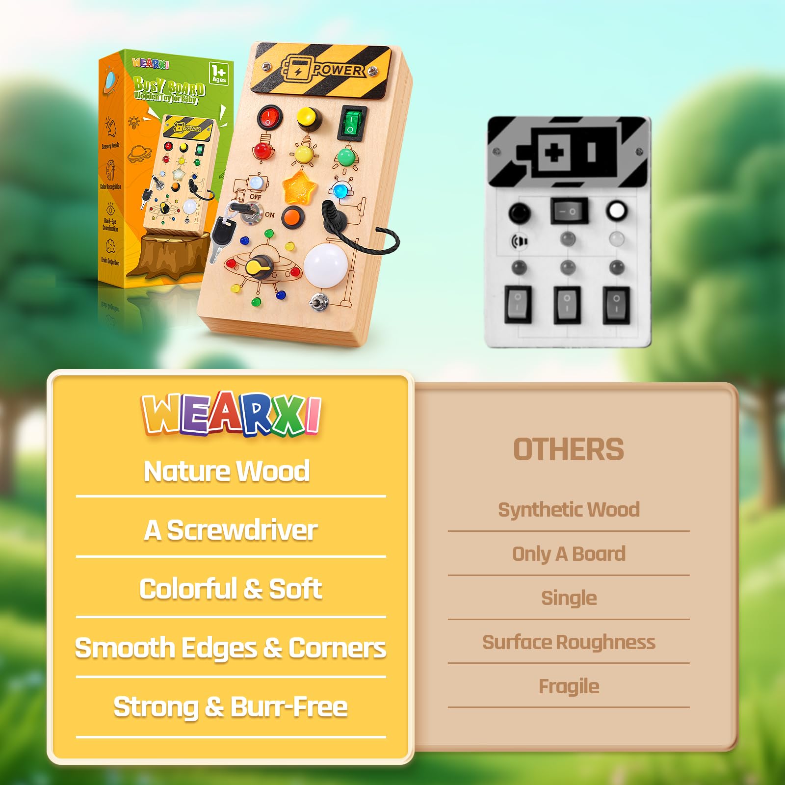 • [Perfektes Kleinkindspielzeug für 1-3-Jährige] – Das WEARXI LED wooden busy board ist ein montessori-spielzeug, das speziell für 1-3 jährige entwickelt wurde. Es verfügt über 8 schalterarten und 15 LED lampen, und jeder schalter aktiviert eine andere LED farbe und sorgt so für eine sanfte und augenfreundliche beleuchtung. Diese lichter sind lebendig und dennoch sanft zu jungen augen. Das sensorikbrett mit den abwechslungsreichen schaltern und lichtern fasziniert kleinkinder. Es ist ein perfektes baby- und kinderspielzeug. Es benötigt 2 AAA-Batterien (nicht enthalten)