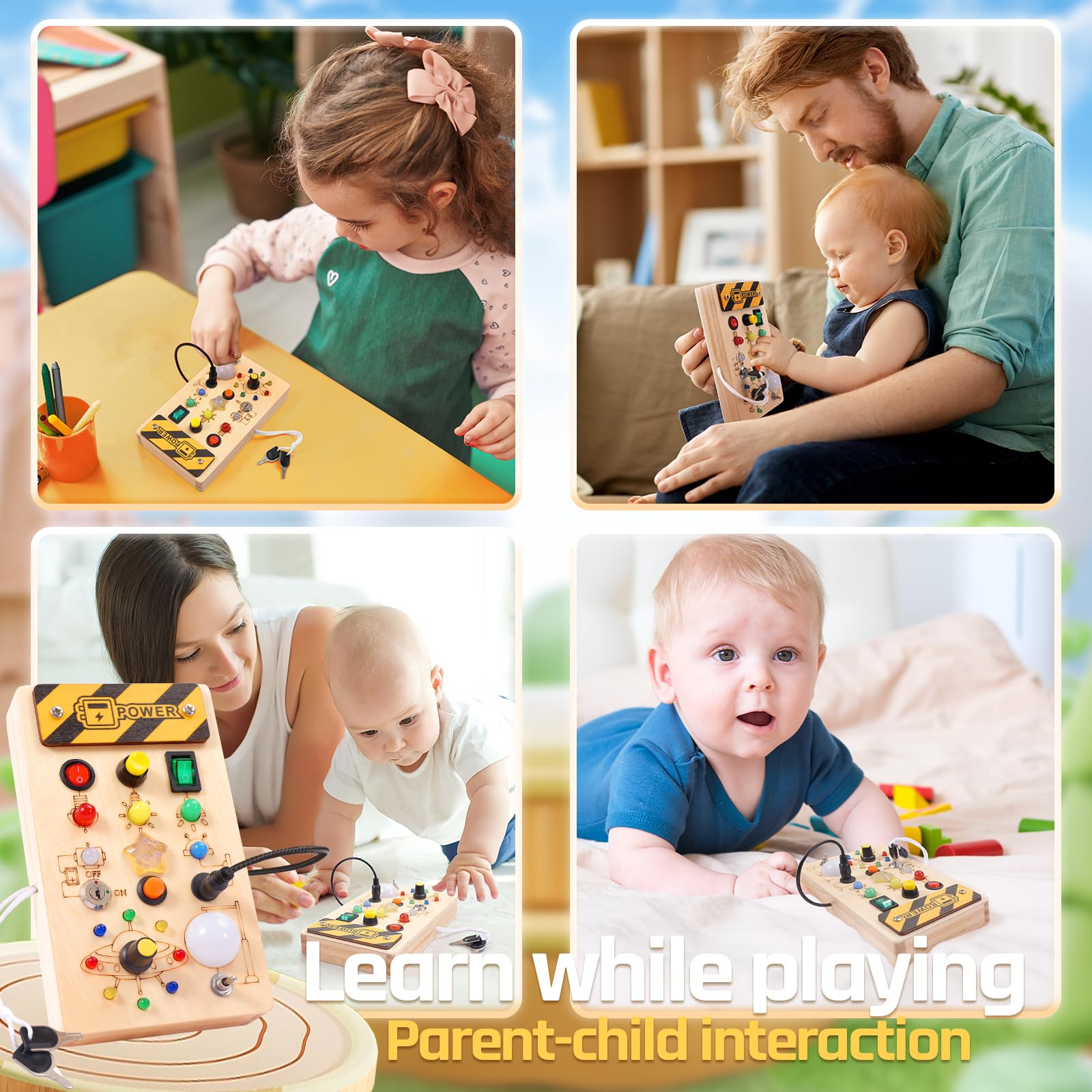 • [Lernen beim Spielen] – Ein großartiges lernspielzeug für mädchen und jungen. Dieses hölzerne LED beschäftigungsbrett hilft babys dabei, feinmotorik zu entwickeln, die Hand-Augen-Koordination und farbunterscheidung zu üben und ihre Intelligenz zu entwickeln. Dieses sensorische spielzeug ist gut konstruiert und alle druckknöpfe haben die perfekte größe, damit kleinkinder sie leicht drücken können. Es ist auch ein perfektes spielzeug für die eltern-Kind-Interaktion. Ihr kind braucht mehr zeit mit Ihnen und das gemeinsame spielen mit dem beschäftigungsbrett wird eine lustige familienzeit sein