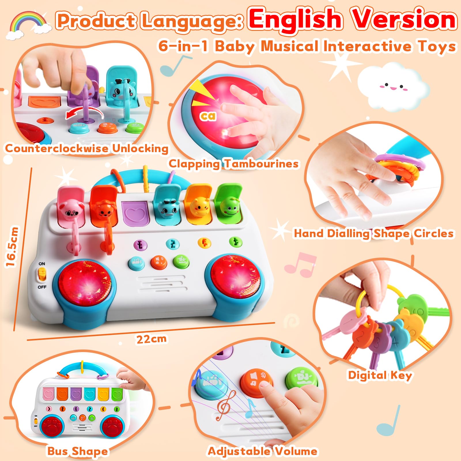 • 5 In 1 Spielzeug ab 1 Jahr (Die Musik ist englischsprachig und die Lautstärke ist einstellbar) : 6 verschiedene Tasten, um die Tür zu öffnen, um verschiedene Tiere zu erforschen, um die kognitiven Fähigkeiten zu verbessern, kleine Hände klatschen die rote Trommel wird Lichter und Töne senden, das Spielzeug ist insgesamt busförmig, 3 Arten von Tasten zum Einstellen der verschiedenen Musikmodi und Lautstärke.Kinder können die Tür für Tiere schließen und den Schlüsselring umschalten, um die Fähigkeit der Hand-Augen-Koordination zu verbessern.