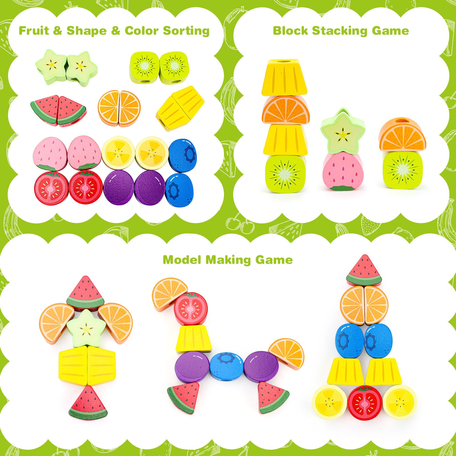 - 🍉 Montessori Spielzeug ab 2-5 Jahre: Dieses pädagogische Holzspielzeug kombiniert Steckspiele, Fädelperlen, Stapelsteine und Sortierübungen in einem Set. Mit 20 bunten Früchte Holzperlen (10 Früchte/Form), 8 doppelseitigen Vorlagenkarten und stapelbaren Bausteinen fördert es Farbenlernen, Formerkennung und Zählübungen. Ideal als spielzeug ab 2 jahre für Feinmotorik-Training, Sensorik Spiele und erste Montessori-Lernübungen.