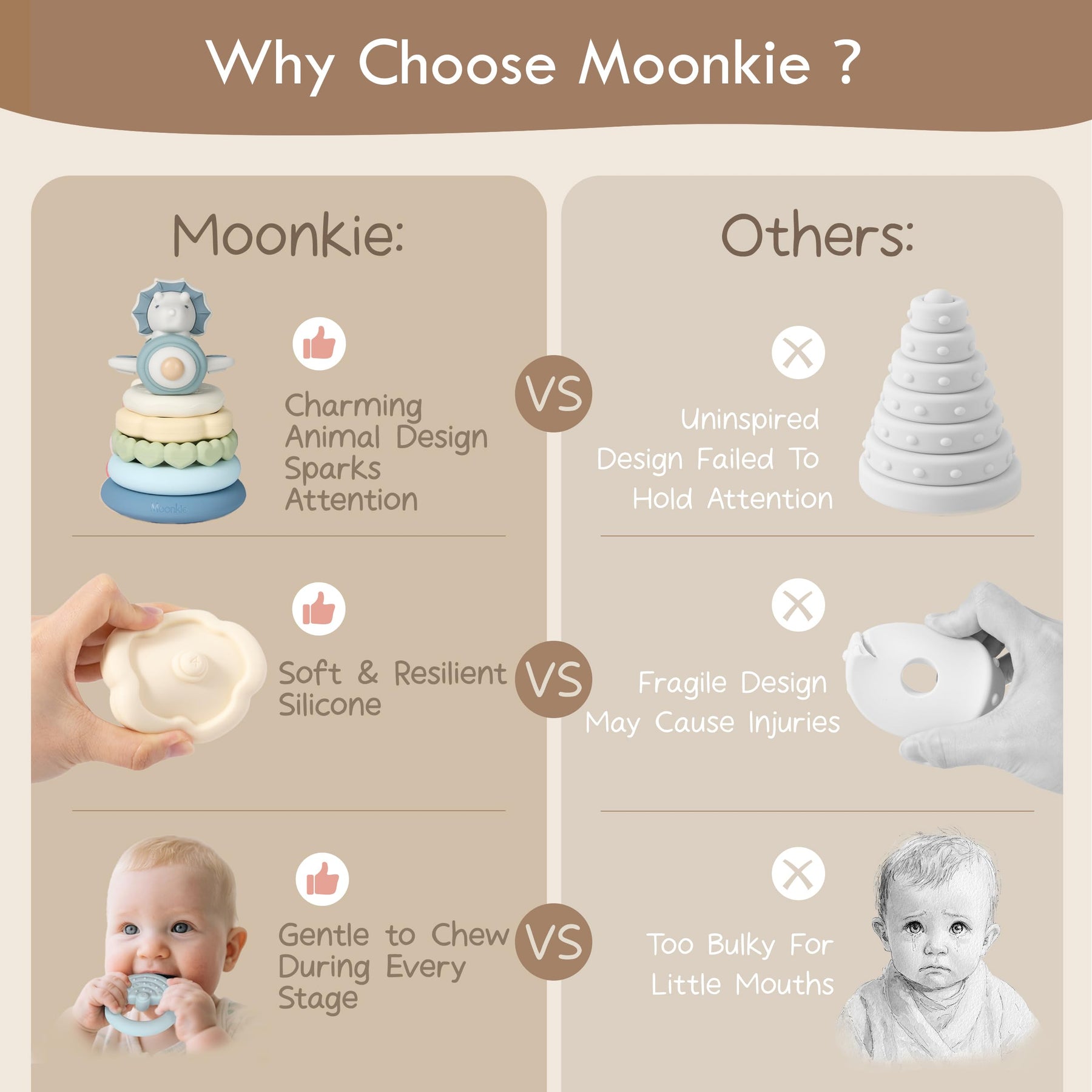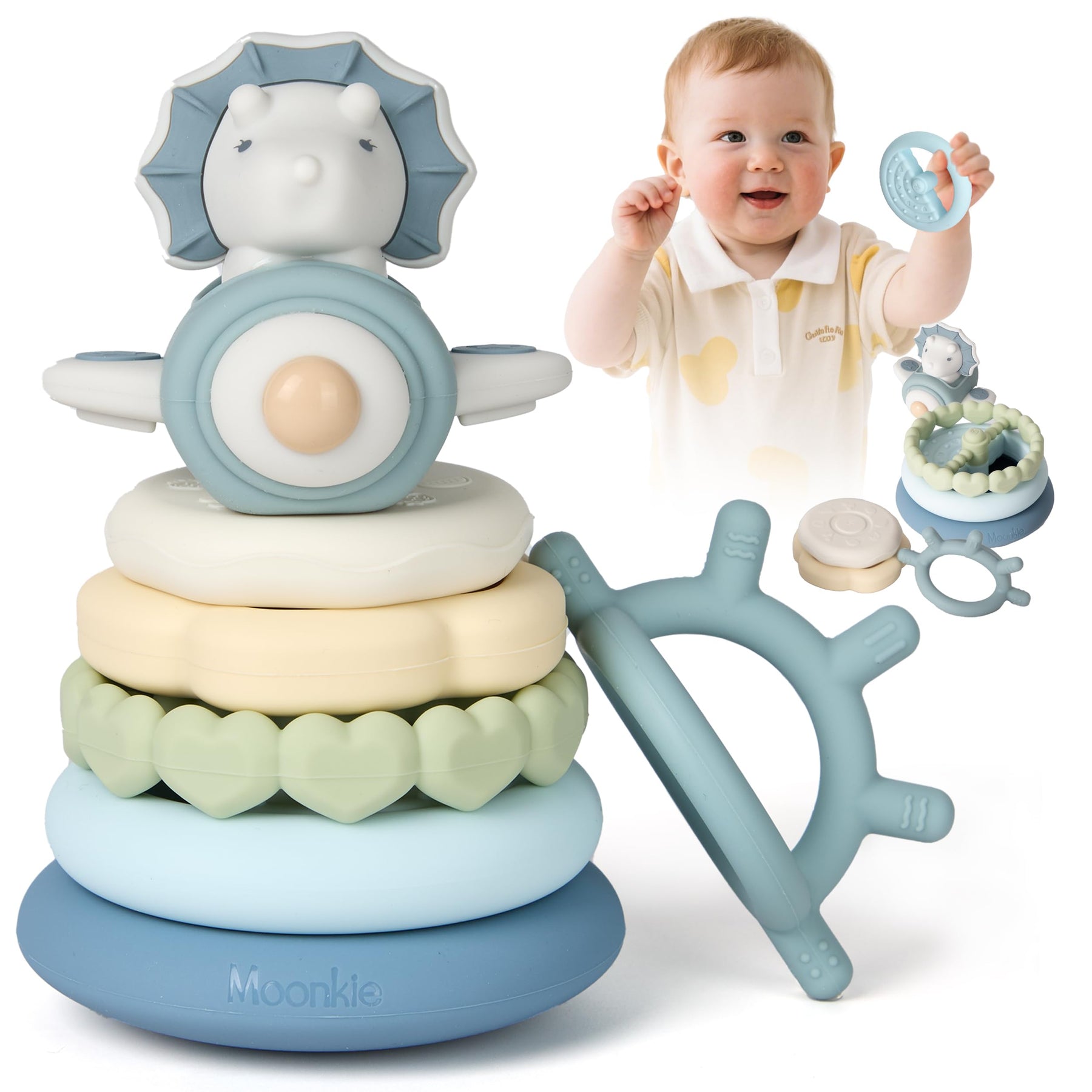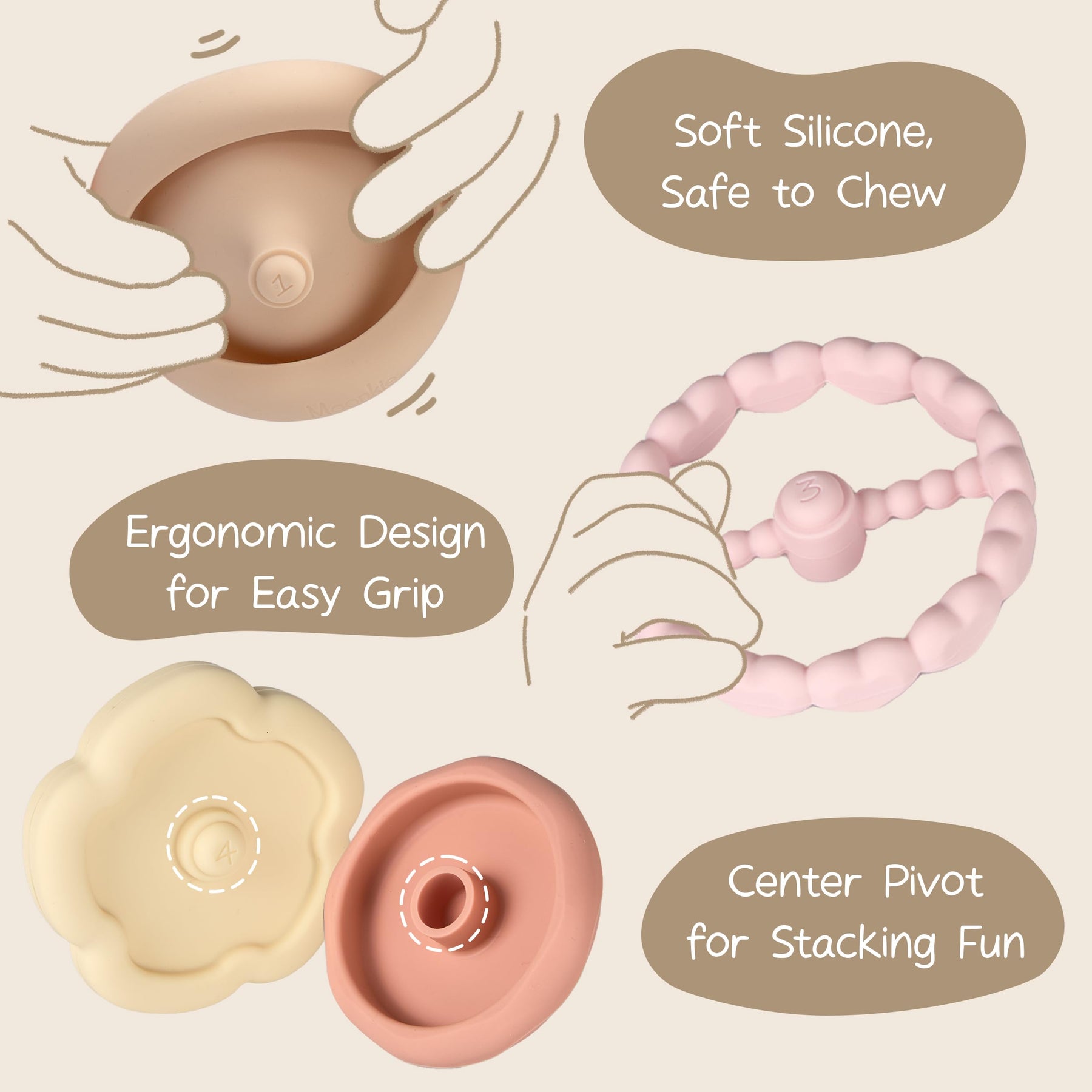 • ✨【Entwicklungsbegleitung über mehrere Phasen & Kompetenzaufbau】Moonkie stapelspielzeug set wächst mit Deinem Kind. Es lindert im Zahnungsalter (6-12 Monat) Zahnfleischschmerzen mit weichen, greiffreundlichen Ringen für kleine Hände. Ab 12 Monaten fördern der rutschfeste Griffknopf in der Mitte und die offene Ringstruktur selbstständiges Stapeln. So werden das räumliche Vorstellungsvermögen, das Erfassen von Reihenfolgen und die kognitive Entwicklung gefördert – alles in einem vielseitigen Babyspielzeug.