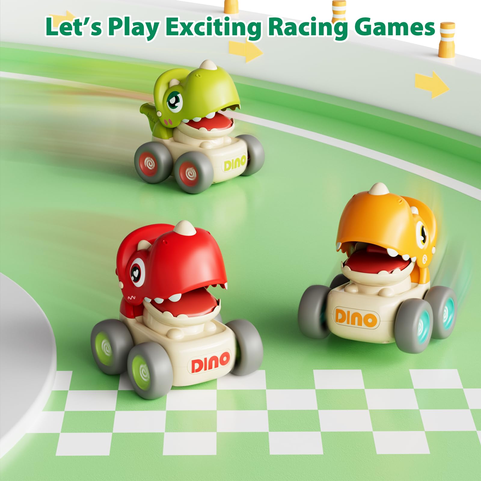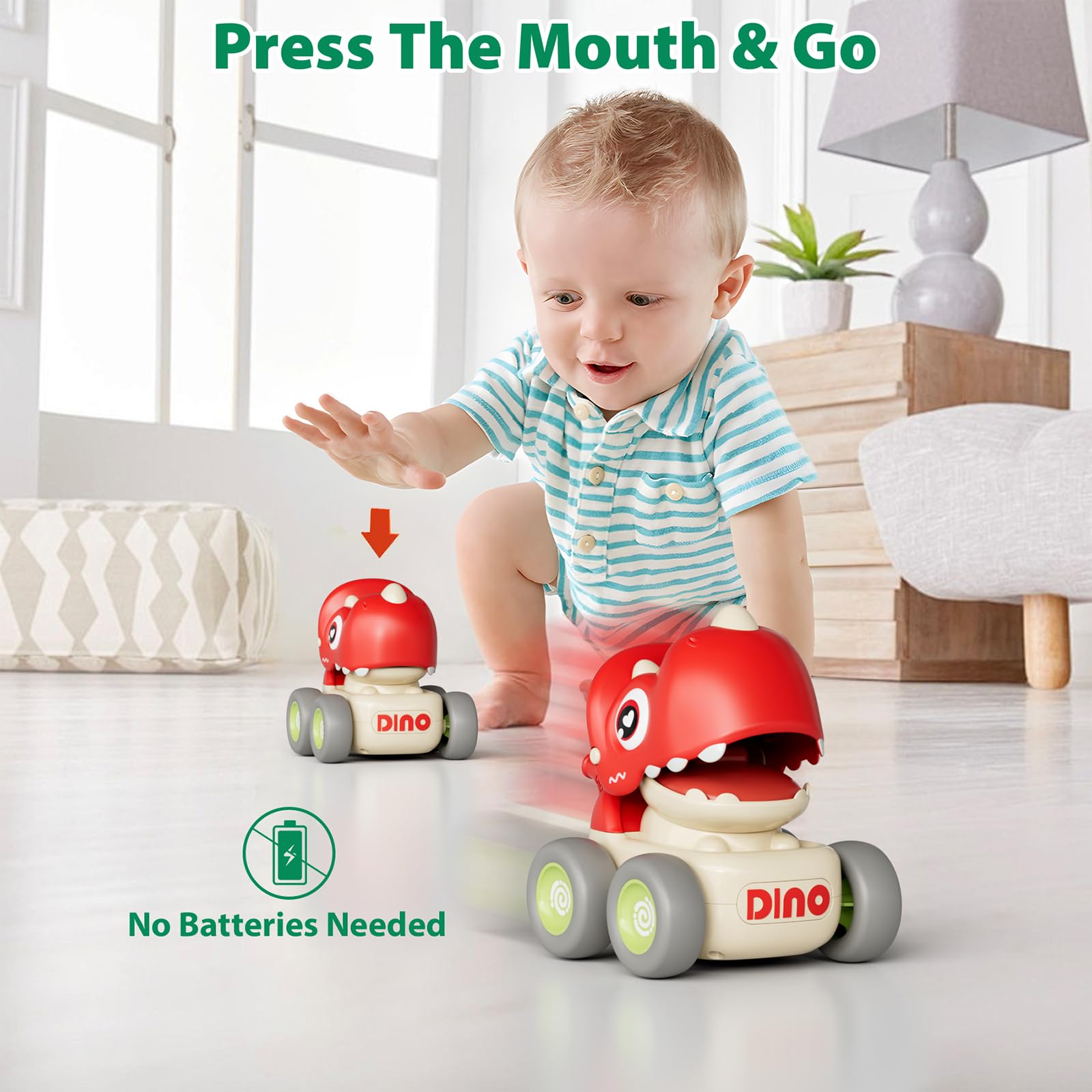 - 【Press and Go Spaß】 Keine Batterien erforderlich, das niedliche Auto beginnt zu fahren, indem man auf den Mund des Dinosaurier-Spielzeug autos drückt, einfach und unterhaltsam für Kleinkinder. Ausgestattet mit rutschfesten, verschleißfesten Rädern für stabilen Halt. Die Kinder können mit den Autos drinnen oder draußen Rennen fahren. Ideales Spielzeug für ab 1-3 jahr Kleinkinder, Jungen und Mädchen.
