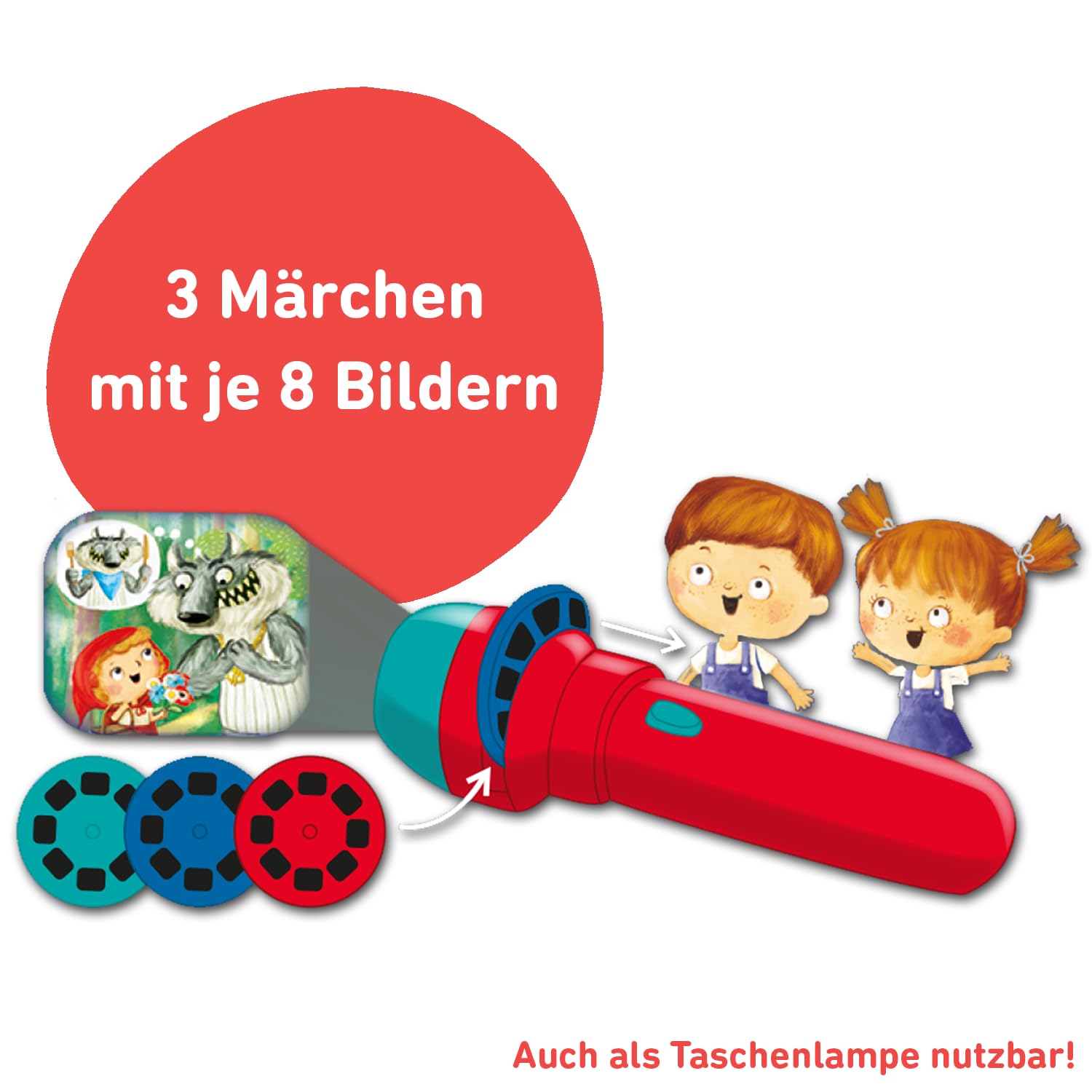 Neben der Taschenlampe sind drei Bildscheiben mit jeweils acht Bildern der drei beliebten Kindergeschichten enthalten. Dank der einfachen Handhabung können die Kinder ganz allein in der selbstgebauten Höhle, auf dem Bett oder im Wohnzimmer in die Märchenwelten eintauchen oder am Abend gemeinsam mit den Eltern ihre Lieblingsmärchen neu erzählen.