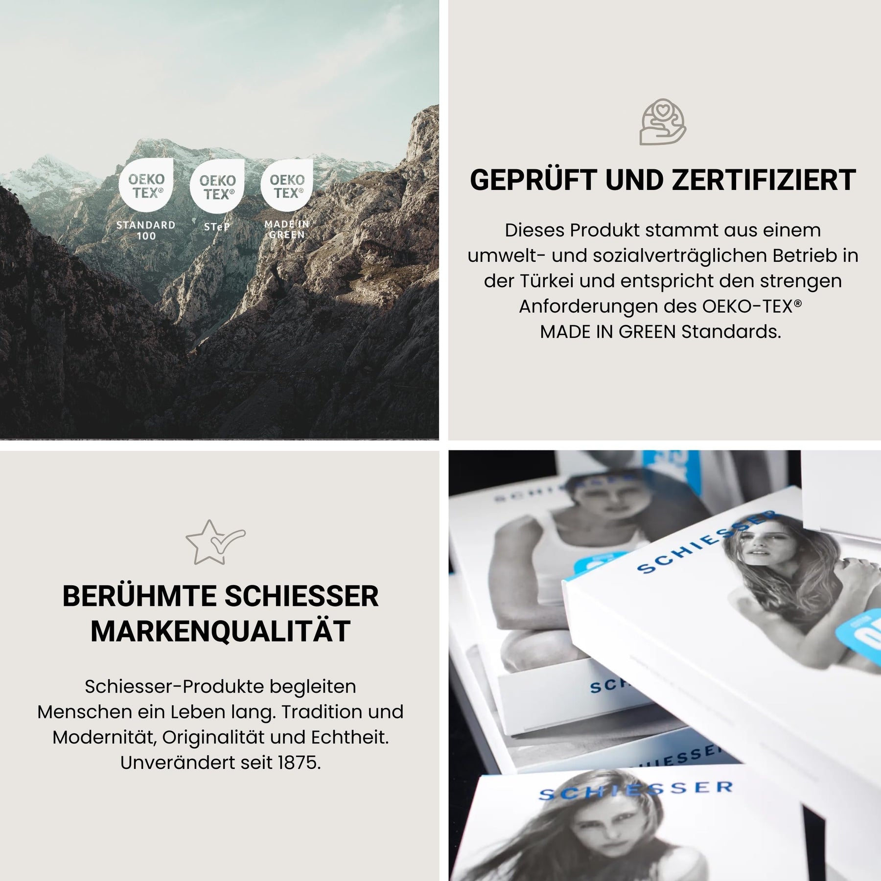 Dieses Produkt stammt aus einem umwelt- und sozialverträglichen Betrieb in der Türkei und entspricht den strengen Anforderungen des OEKO-TEX®: MADE IN GREEN Standards (M21LRE495 Hohenstein HTTI). Wir garantieren Ihnen zudem, dass es aus schadstoffgeprüften Materialien besteht. Alle SCHIESSER Home Produkte durchlaufen einen Ultra-Testmarathon. Wir prüfen akribisch Passform, Komfort und Qualität und waschen unsere Samples mehrfach, sodass wir sicher sein können, dass sie lange halten. Wir haben den Anspruch, Heimtextilien von höchster Qualität zu kreieren: Stoffe, die nicht einlaufen, Reißverschlüsse, die nicht kaputt gehen und Nähte, die halten. Wir wünschen viel Freude mit Ihrem neuen SCHIESSER Produkt.