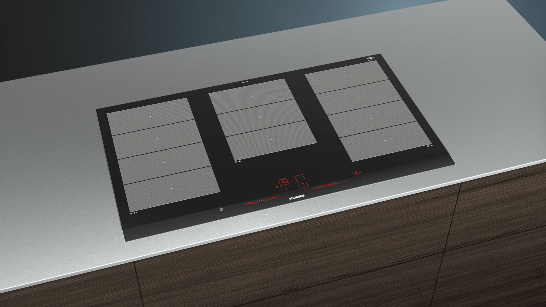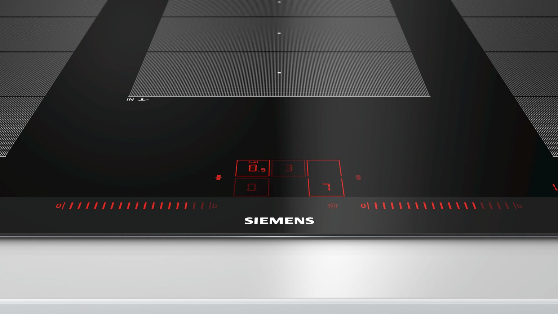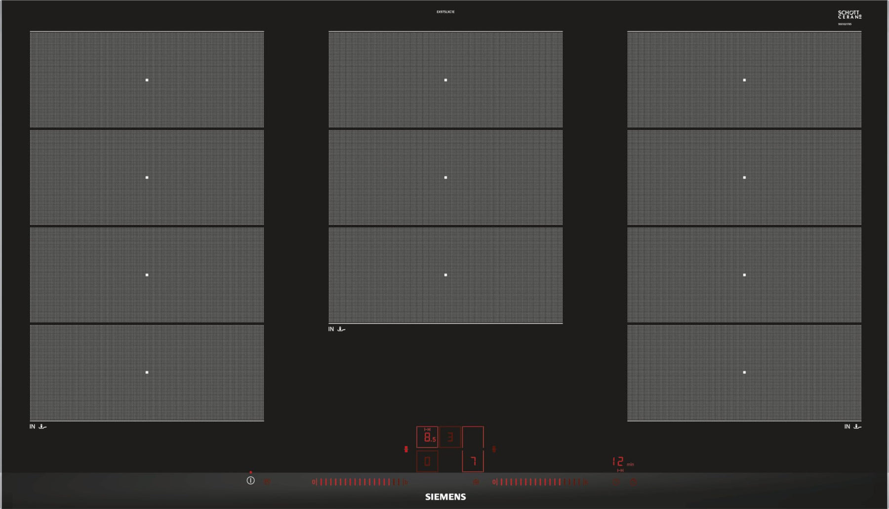 Siemens iQ700 Einbau-Induktionskochfeld EX975LXC1E 90 cm / Schwarz / Autark / Maße: H x B x T: 5,1 x 91,2 x 52,0 cm / Glaskeramik-Kochfeld / varioMotion: Speichert die Heizeinstellungen beim Verschieben des Kochgeschirrs / Dual lightSlider: Einfache und intuitive Bedienung der Induktionsherdplatte / bratSensor Plus: Verhindert Anbrennen / powerMove Plus: Ändern Sie die Leistungsstufe beim Kochen ganz einfach durch Bewegen Ihres Kochgeschirrs / powerBoost-Funktion: Kürzere Ankochzeiten mit bis zu 50 % mehr Leistung / Timer mit Sicherheitsabschaltung / Kindersicherung.