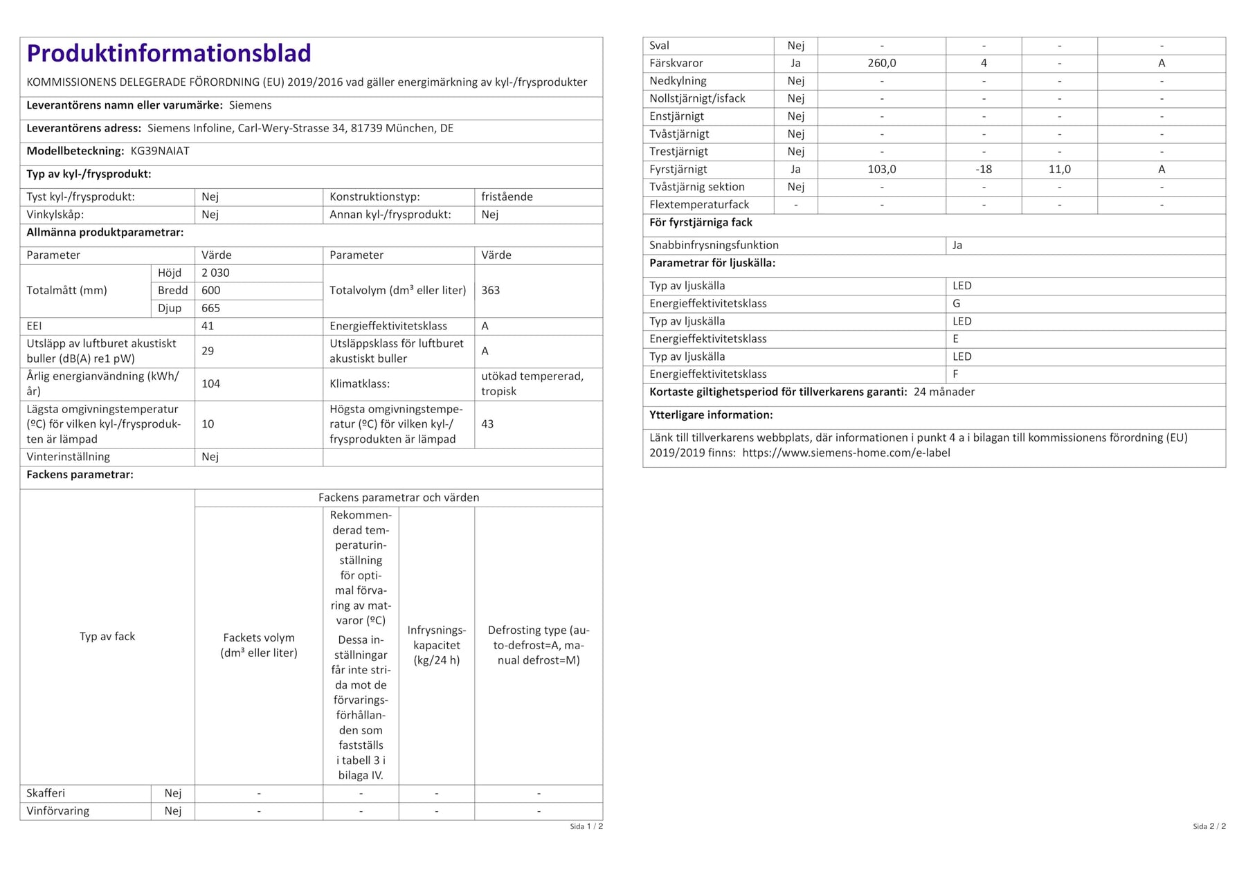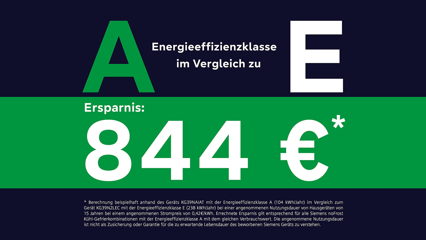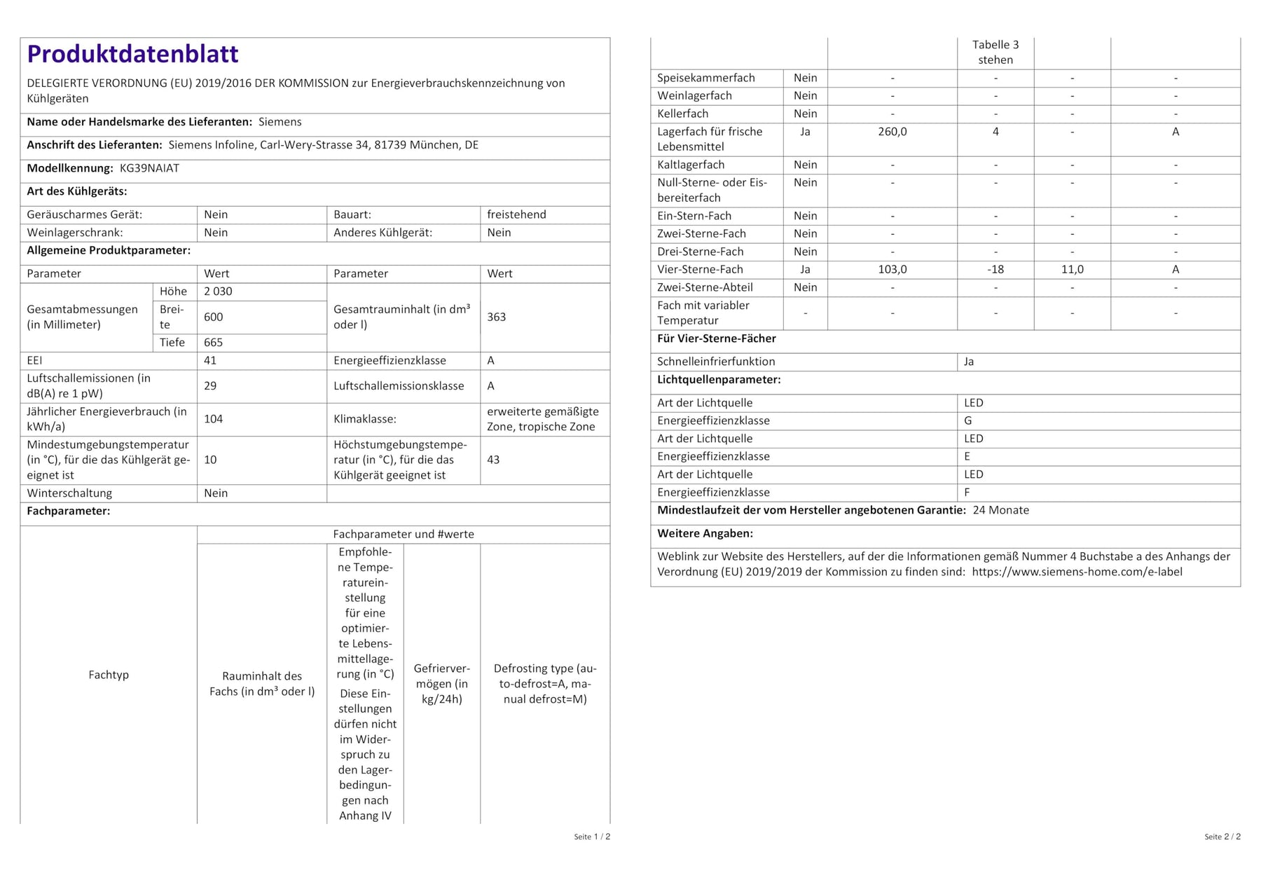 Einzelheiten: Siemens iQ500 Freistehende Kühl-Gefrier-Kombination KG39NAIAT mit Gefrierbereich unten / 60 cm breit / 203 cm hoch / Energie-Effizienzklasse A / Edelstahl-Look / antiFingerprint Spezialbeschichtung / Gesamtfassungsvermögen: 363 Liter/ Flaschenkühler: bottleCooler / hyperFresh Box mit Feuchteregelung / Vertikaler Stangengriff / EmotionLight – sanft aufdimmende LED-Innenbeleuchtung / Getrennte Temperaturregelung für Kühl- und Gefrierraum / noFrost: nie wieder abtauen / multiAlarm-System: Akustischer Alarm Kühlschranktür / Urlaubsschaltung / superKühlen – superCooling / superFreezing – super Gefrieren mit Eingefrierautomatik / Abtau-Automatik im Kühlteil / Multi-Airflow-System.Hersteller: SiemensModell: KG39NAIATEnergieeffizienzklasse: A auf einer Energieeffizienzklasse-Skala von A bis GEnergieverbrauch: 104 kWh/JahrGesamtfassungsvermögen: 363 lGeräuschwert: 29 dB(A) re 1 pWKühlteil:Kühlraum: 363 l Nutzinhalt / 5 Abstellflächen aus Sicherheitsglas, davon 3 höhenverstellbar / 1 Flaschenabsteller, 2 Türabsteller / 1 Flaschenkühler (bottleCooler).Gefrierteil:noFrost – keine Eisbildung & schnelleres Abtauen / ****-Gefrierraum: 103l Nutzinhalt / Gefriervermögen: 11 kg in 24 Std. / 3 transparente Gefriergut-Schubladen.Frischhaltesystem:1 hyperFresh ◄0°C► Box – Fisch und Fleisch bleiben länger frisch.1 hyperFresh ◄0°C► Box – Obst und Gemüse bleiben länger frisch.Bedienelemente:Anz. Regelbetrieb grün Kühlen, Superschalter Kühlen, Superschalter Gefrieren, Temperaturanzeige für Gefrieren, Temperaturanzeige für Kühlen, Warnfunktionen Gefrierteil, Warnsignal Störung Gefrieren, Warnsignal Tür offen.