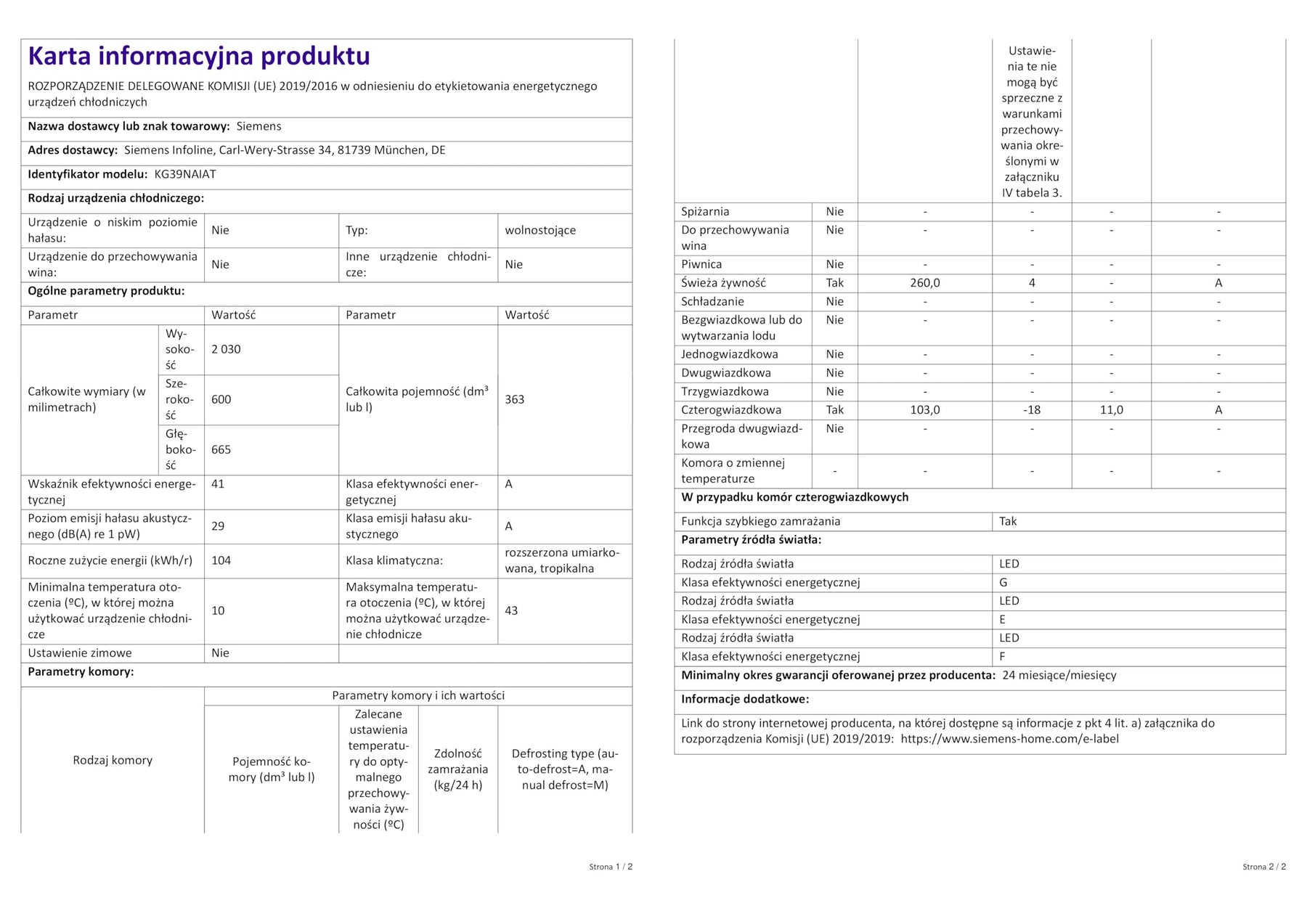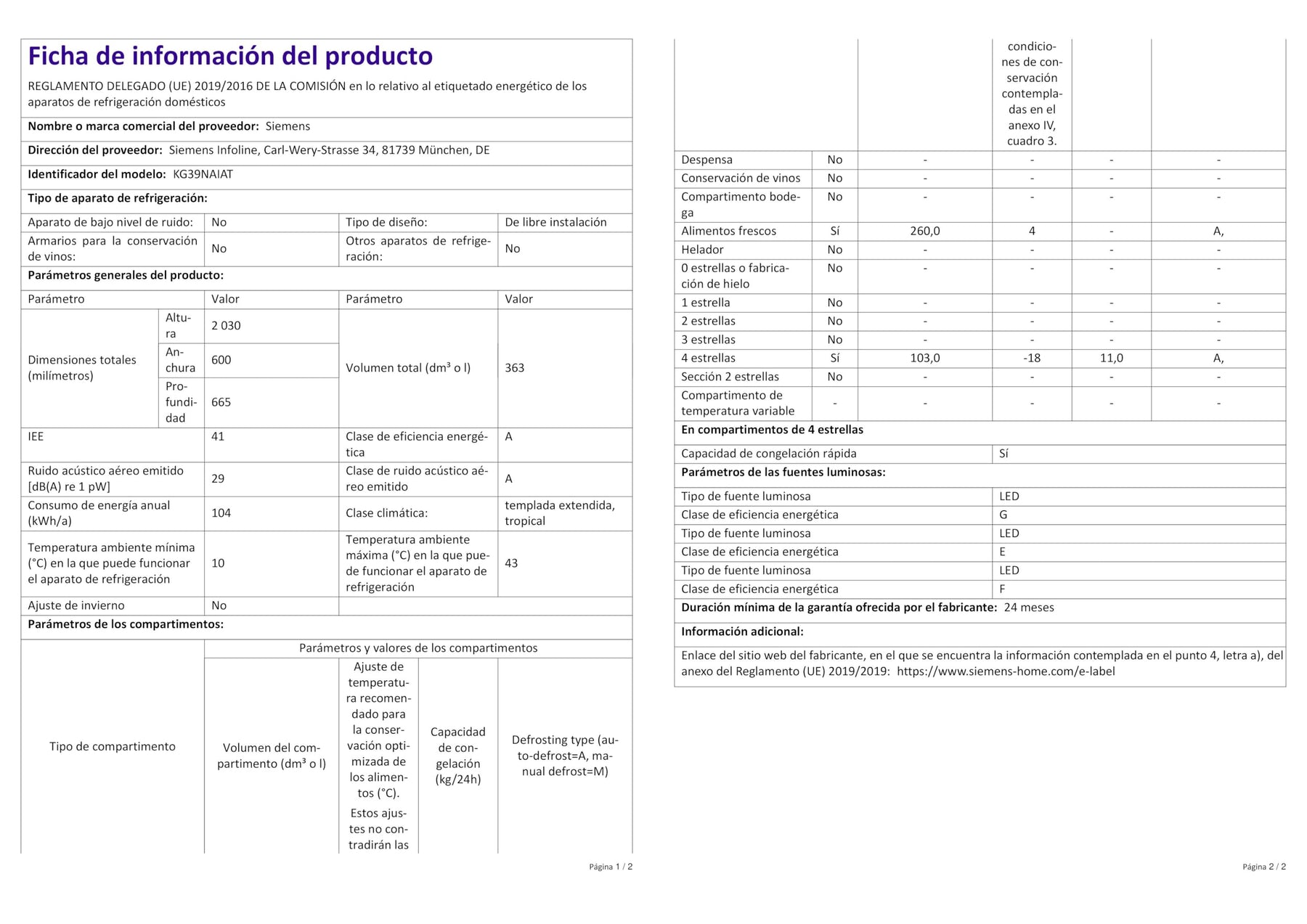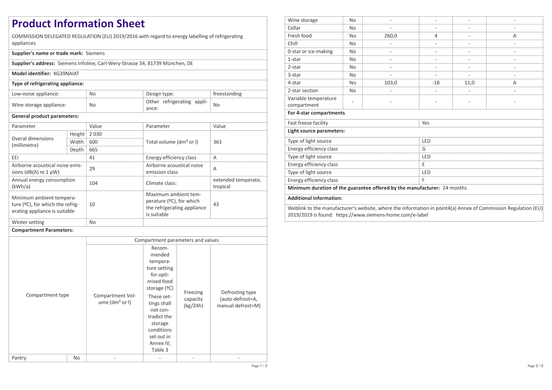 Einzelheiten: Siemens iQ500 Freistehende Kühl-Gefrier-Kombination KG39NAIAT mit Gefrierbereich unten / 60 cm breit / 203 cm hoch / Energie-Effizienzklasse A / Edelstahl-Look / antiFingerprint Spezialbeschichtung / Gesamtfassungsvermögen: 363 Liter/ Flaschenkühler: bottleCooler / hyperFresh Box mit Feuchteregelung / Vertikaler Stangengriff / EmotionLight – sanft aufdimmende LED-Innenbeleuchtung / Getrennte Temperaturregelung für Kühl- und Gefrierraum / noFrost: nie wieder abtauen / multiAlarm-System: Akustischer Alarm Kühlschranktür / Urlaubsschaltung / superKühlen – superCooling / superFreezing – super Gefrieren mit Eingefrierautomatik / Abtau-Automatik im Kühlteil / Multi-Airflow-System.Hersteller: SiemensModell: KG39NAIATEnergieeffizienzklasse: A auf einer Energieeffizienzklasse-Skala von A bis GEnergieverbrauch: 104 kWh/JahrGesamtfassungsvermögen: 363 lGeräuschwert: 29 dB(A) re 1 pWKühlteil:Kühlraum: 363 l Nutzinhalt / 5 Abstellflächen aus Sicherheitsglas, davon 3 höhenverstellbar / 1 Flaschenabsteller, 2 Türabsteller / 1 Flaschenkühler (bottleCooler).Gefrierteil:noFrost – keine Eisbildung & schnelleres Abtauen / ****-Gefrierraum: 103l Nutzinhalt / Gefriervermögen: 11 kg in 24 Std. / 3 transparente Gefriergut-Schubladen.Frischhaltesystem:1 hyperFresh ◄0°C► Box – Fisch und Fleisch bleiben länger frisch.1 hyperFresh ◄0°C► Box – Obst und Gemüse bleiben länger frisch.Bedienelemente:Anz. Regelbetrieb grün Kühlen, Superschalter Kühlen, Superschalter Gefrieren, Temperaturanzeige für Gefrieren, Temperaturanzeige für Kühlen, Warnfunktionen Gefrierteil, Warnsignal Störung Gefrieren, Warnsignal Tür offen.