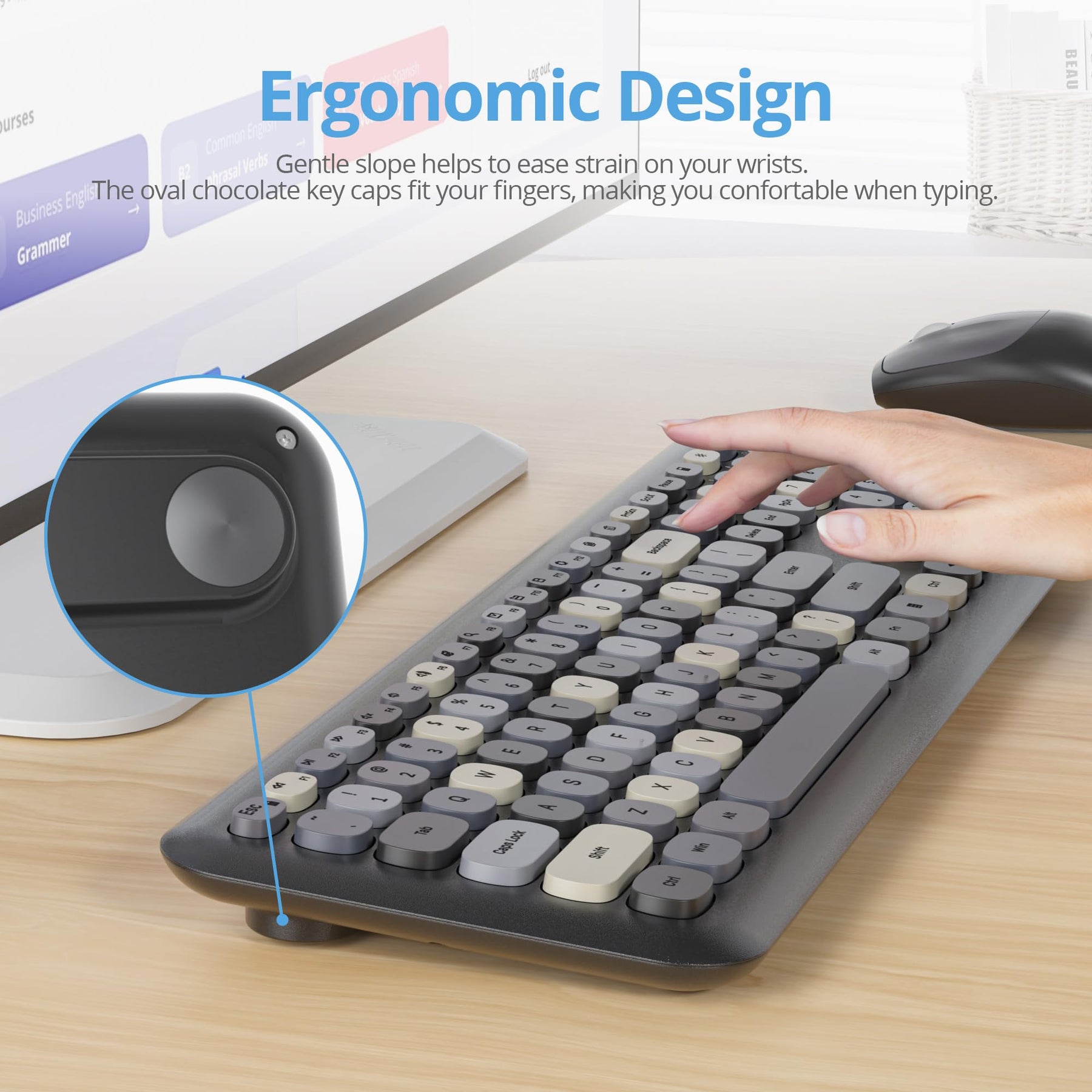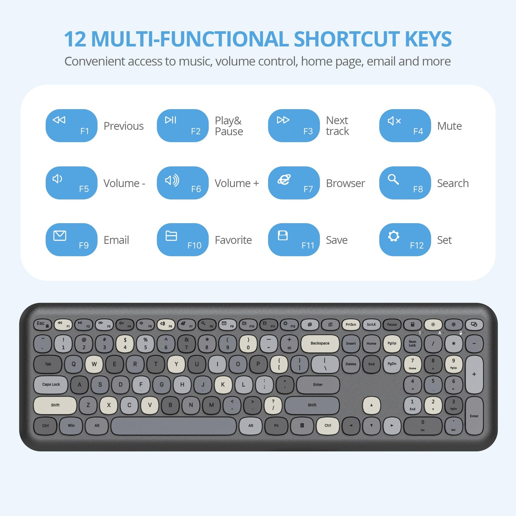 • ✿【110-Tasten-Vollformat-Tastatur】Diese niedliche Membran Tastatur im Schreibmaschinenstil mit Ziffernblock verwendet geräuschreduzierende Tasten, während die runden, konkaven Retro-Tasten die Form Ihrer Fingerspitzen anpassen und bequem zu drücken sind. Wie bei alten Schreibmaschinen ermüden Ihre Hände nicht, selbst wenn Sie lange mit diesem Tastatur Maus Set Kabellos arbeiten.