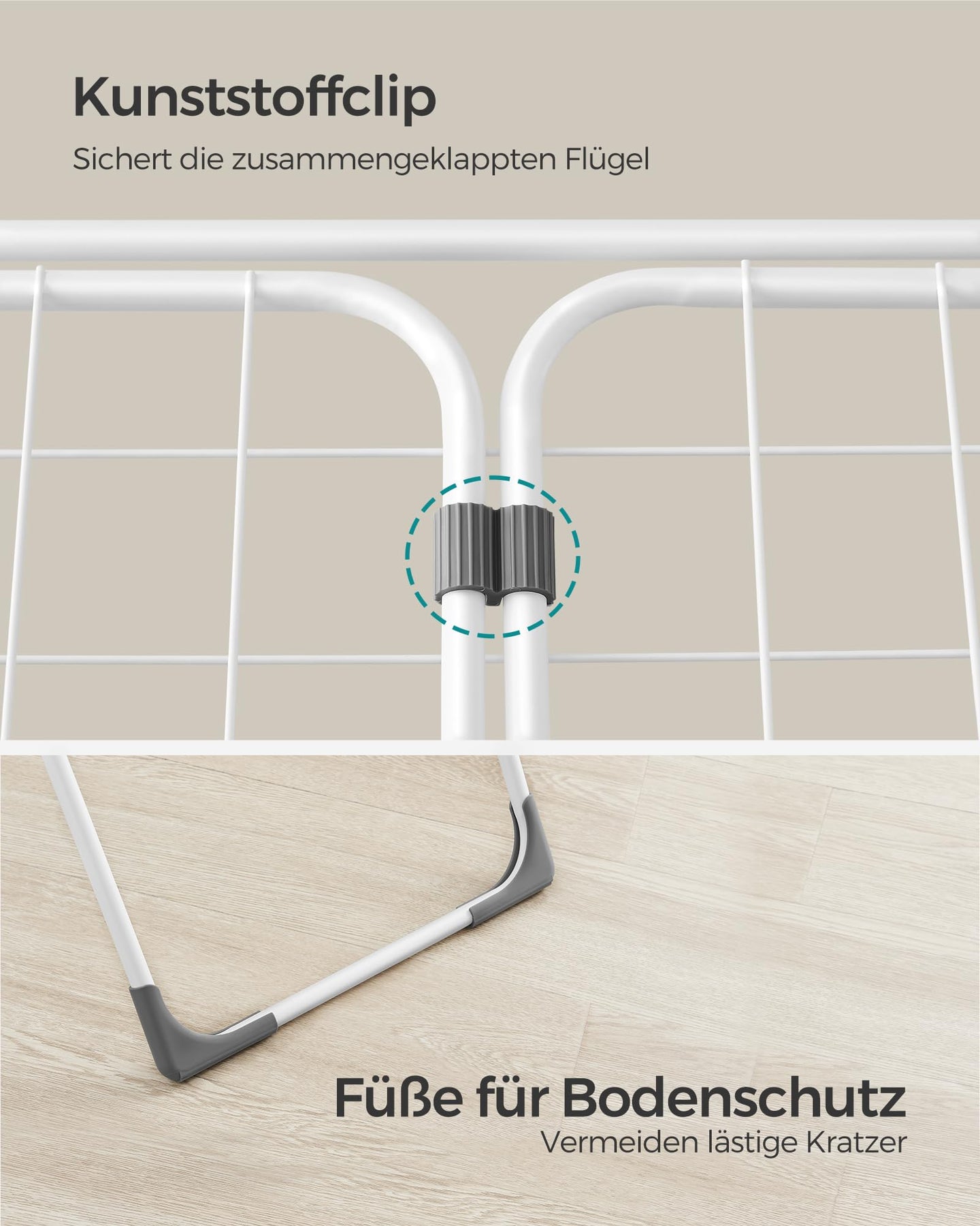 - [Für Innen- und Außenbereich geeignet] Robuste Stahlrohre mit spezieller Beschichtung, langlebige Kunststoffverbindungsstücke – der Flügelwäscheständer kann sowohl im Innen- als auch im Außenbereich verwendet werden. Er biegt oder rostet mit der Zeit nicht