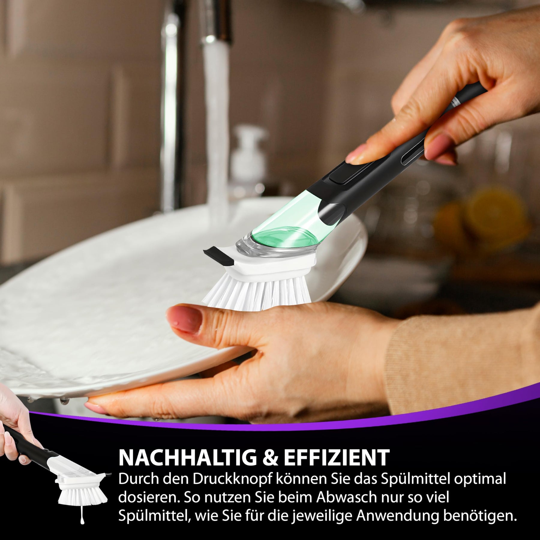 - PRAKTISCH: Mit unserer nachfüllbaren Spülbürste wird Ihr Abwasch ab sofort zur Leichtigkeit. Sie müssen Ihre Hände nicht mehr dreckig machen und ihr Geschirr wird im Handumdrehen strahlend sauber!