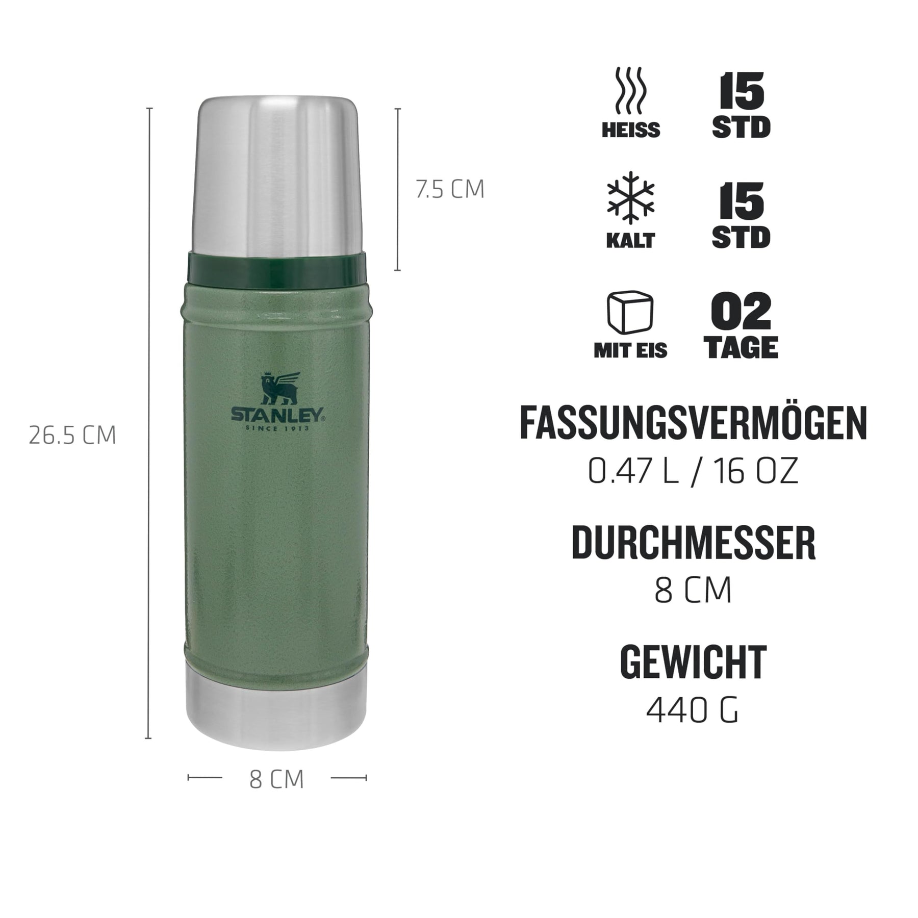Einzelheiten: Die Marke Stanley prägt eine 100-jährige Geschichte. 1913 verändert William Stanley Jr. nachhaltig die Art und Weise, wie heiße Getränke konsumiert werden. Für eine tragbare Flasche kombinierte er die Technologie der Vakuumisolierung mit der Stärke von Stahl und erfand so die erste Edelstahl-Vakuumflasche, die wir heute alle kennen.