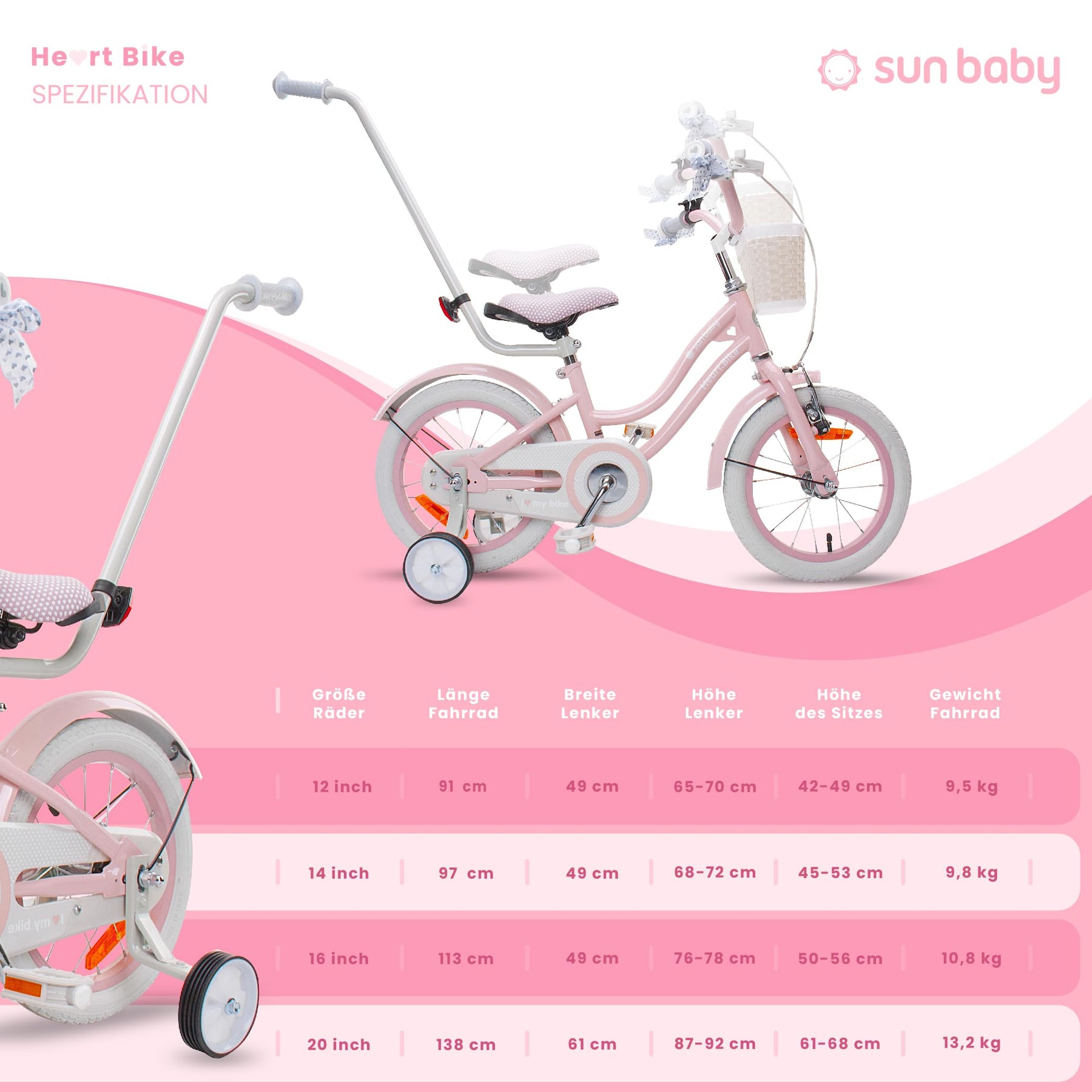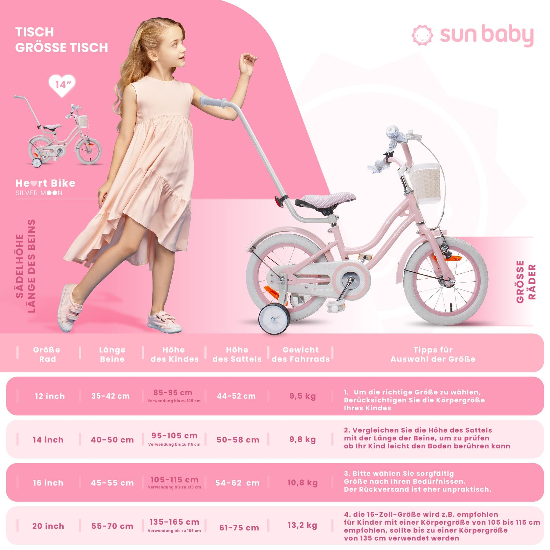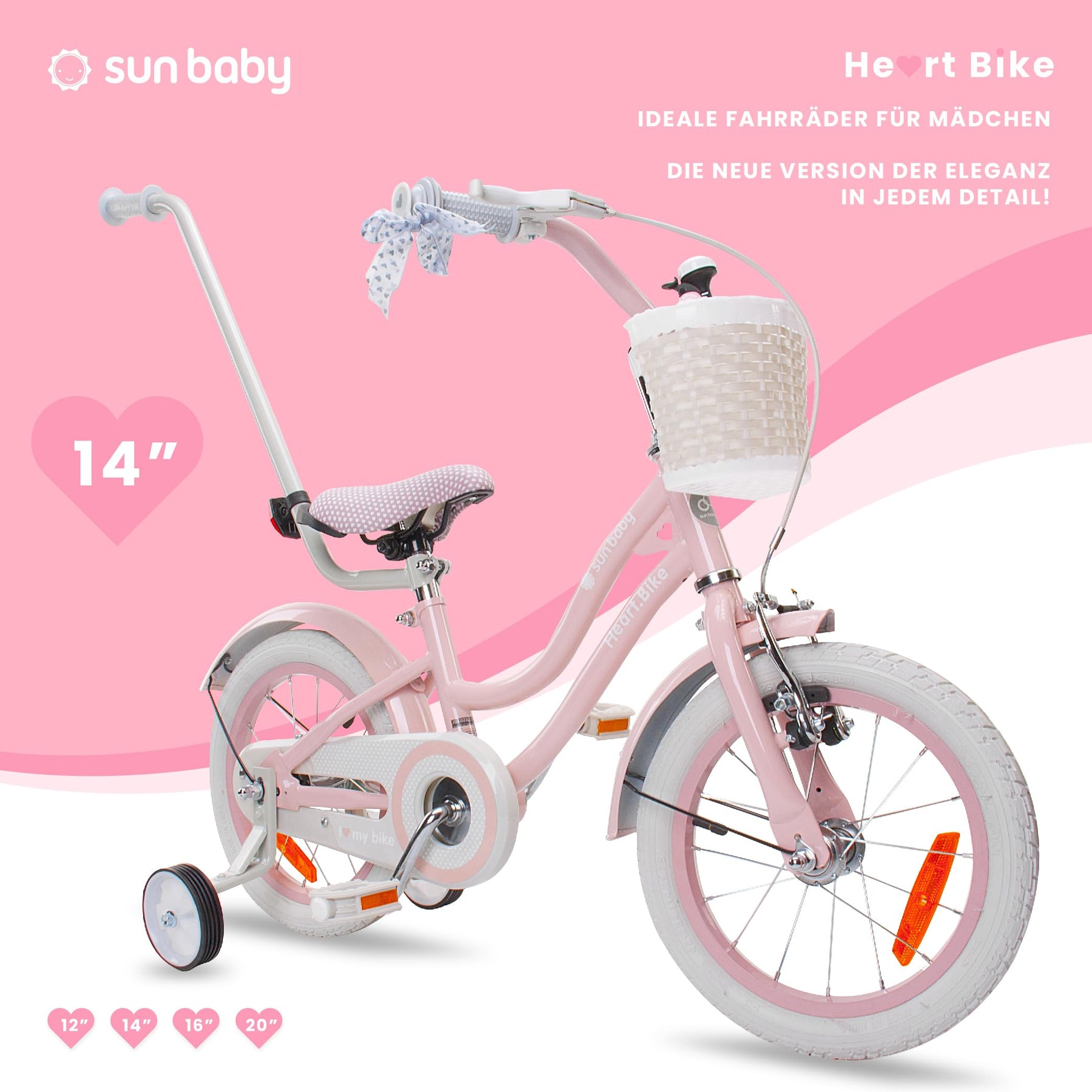 sun baby Mädchenfahrrad 14 Zoll Radgröße Heart Bike zur Auswahl, mit Abnehmbarer Schubstange, Kinderfahrrad für Mädchen von 2 bis 6 Jahre (Silver Moon Rosa, 14 Zoll)