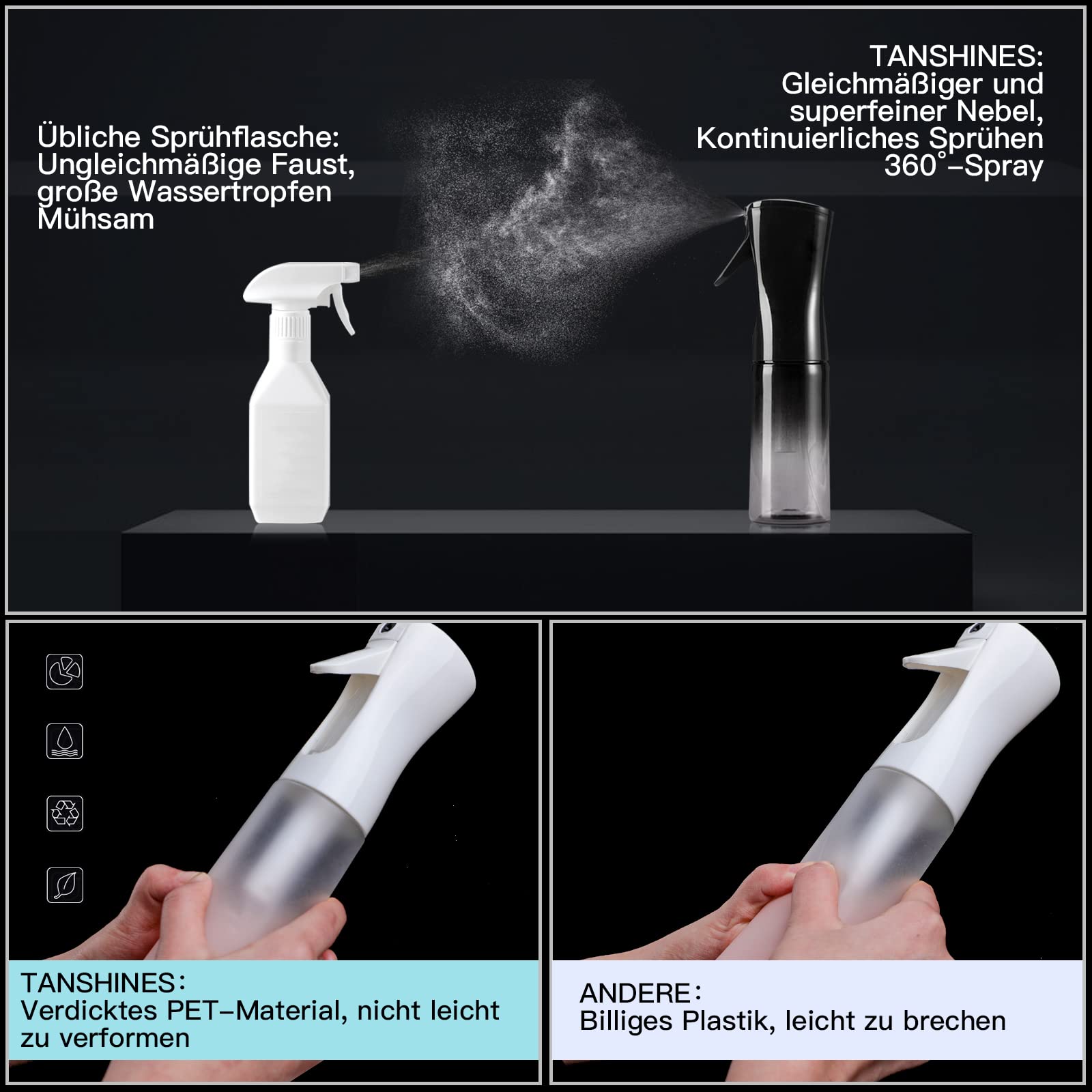 - 【WASSERSPRÜHFLASCHE FRISEUR】Die Wassersprühflasche Friseur hat eine kontinuierliche Sprühtechnologie, um eine Ermüdung der Finger zu verhindern. Die Sprühflasche eignet sich perfekt für Gartenarbeit, Reinigung, Kochen und Friseurarbeiten. Dies wird ermöglicht durch die Pflanzen Spühflasche.