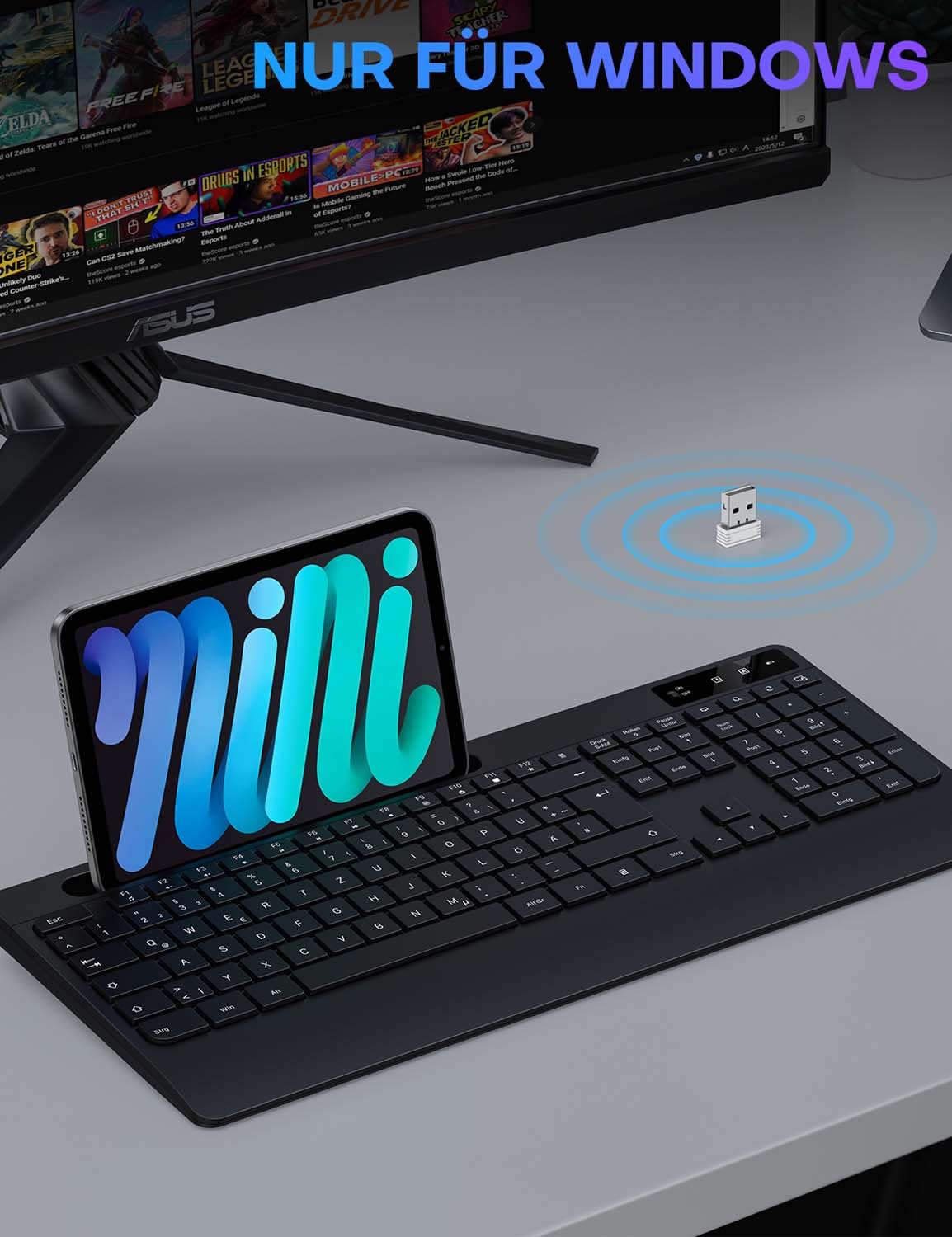 - 【QWERTZ Tastatur】Diese Tastatur wird mit einem gekerbten Ständer von etwa 8.3 Zoll geliefert. Auch bei der Arbeit mit diesem Tastatur- und Mausset verpassen Sie keine Nachrichten von Ihrem Telefon, denn der gekerbten Ständer ermöglicht es Ihnen, Ihr Telefon oder Tablet zum Lesen oder Ansehen von Videos schräg zu stellen