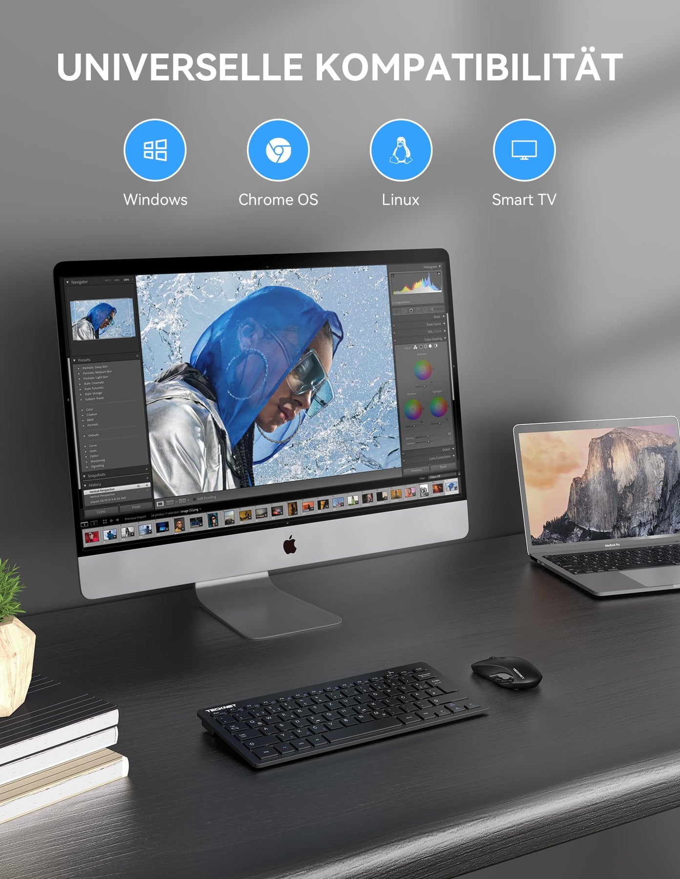 - 【KOMPATIBILITÄT & ZUVERLÄSSIGER SERVICE】Die TECKNET kabellose Tastatur- und Mauskombi unterstützt Windows 11/10/8/7/XP/2000 und funktioniert mit Laptop, Desktop-PC und Chrome Book. Die Tastatur benötigt 2 AAA-Batterien und die Maus 2 AAA-Batterien (nicht im Lieferumfang enthalten).