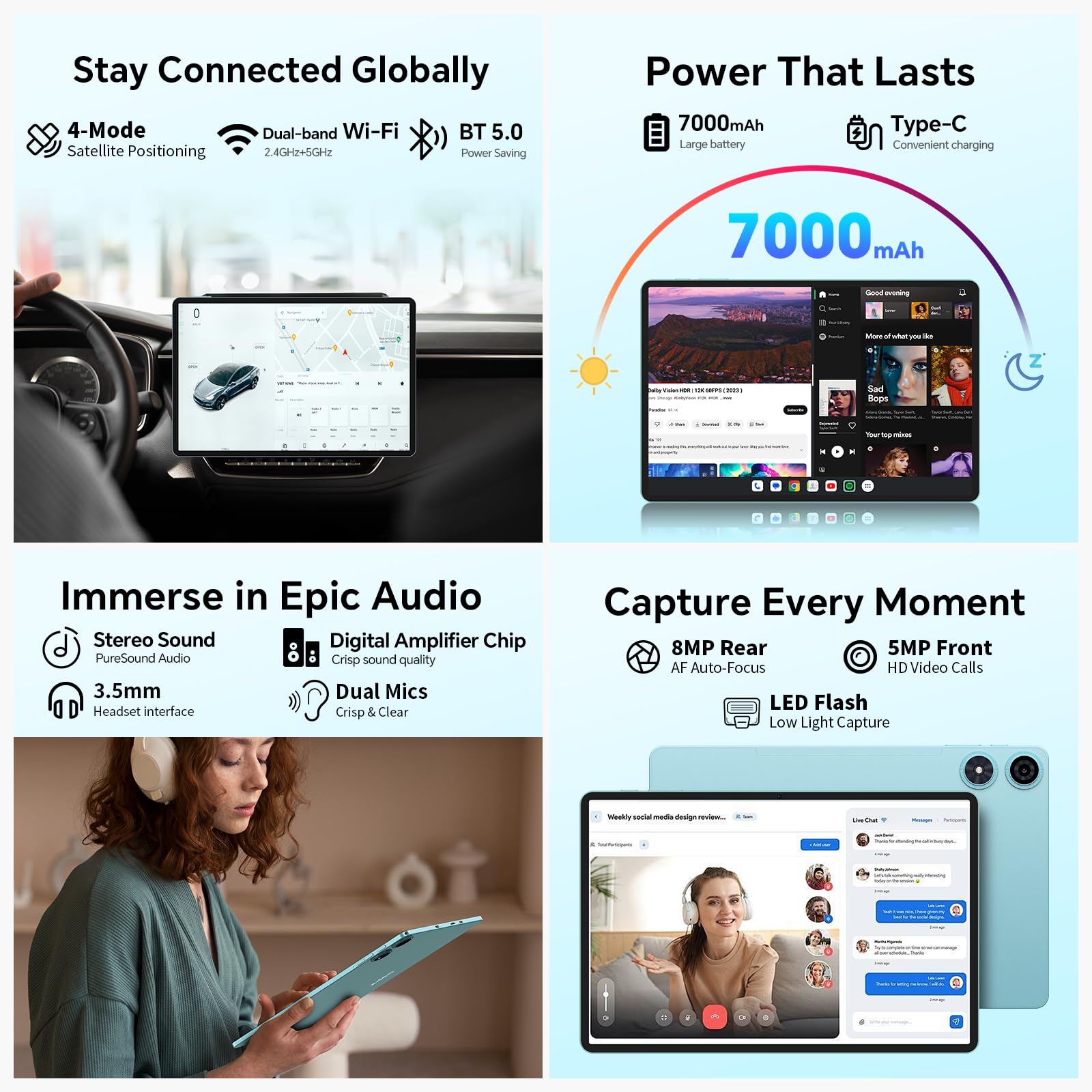 - 🔋【7000mAh Akku + 2 Lautsprecher + GPS】Dieses Android Tablet lte ist mit einer 7000mAh Akku ausgestattet und bietet 10-Stunden-Videowiedergabe, 12-Stunden-Musikwiedergabe und 11-Stunden-Surfen im Internet, was es zum perfekten Begleiter für Arbeit und Freizeit macht. Zwei Stereo-Lautsprecher sorgen für klareren und lauteren Klang. Die vier Navigationsmodi GPS/BDS/GLONASS/GALILEO machen ihn zu einem großartigen Begleiter auf Reisen und zu einem großartigen Helfer für Outdoor-Enthusiasten.
