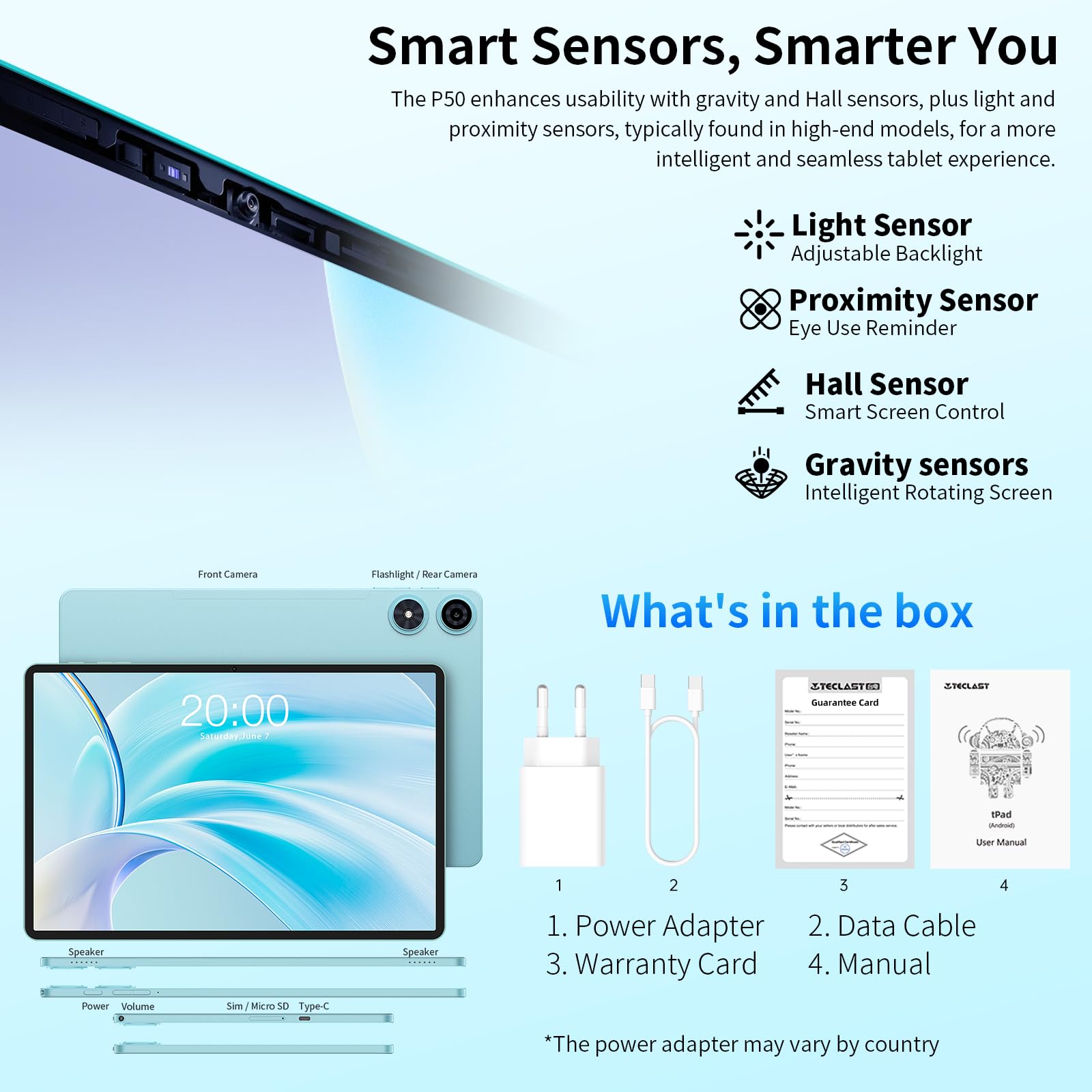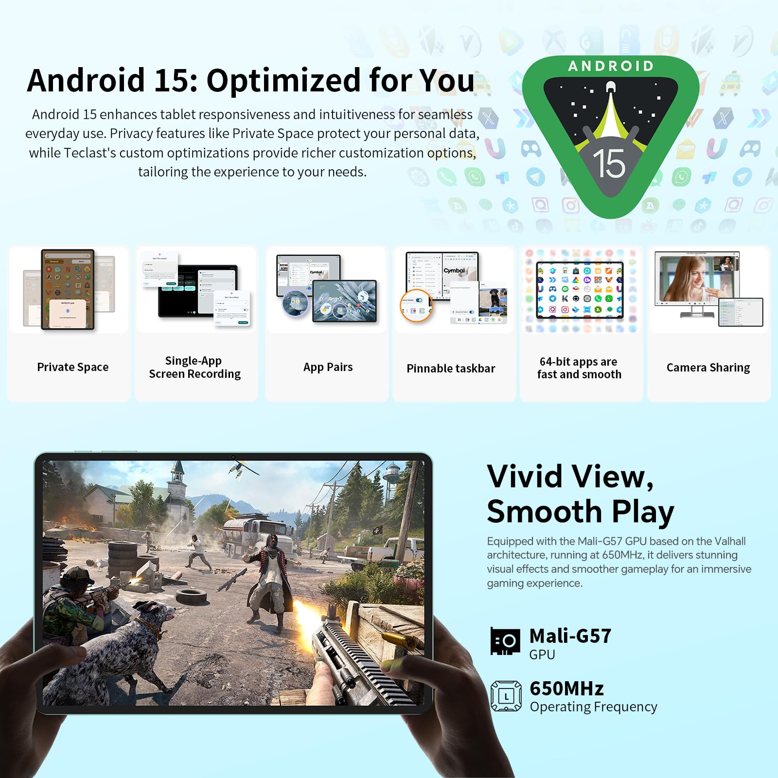 - 🏆【Android 15 Tablet + Octa-Core CPU + GMS】Das TECLAST P50 Android 15 Tablet verfügt über eine hervorragend anpassbare Benutzeroberfläche, Kompatibilität und Betriebseffizienz, damit Sie intelligent arbeiten und spielen können, während der leistungsstarke UNISOC-Octa-Core-Prozessor T7200 einen einfacheren Zugriff auf alltägliche Anwendungen ermöglicht. Außerdem ist es GMS-zertifiziert, sodass Sie häufig verwendete Software einfach aus dem Shop herunterladen können.