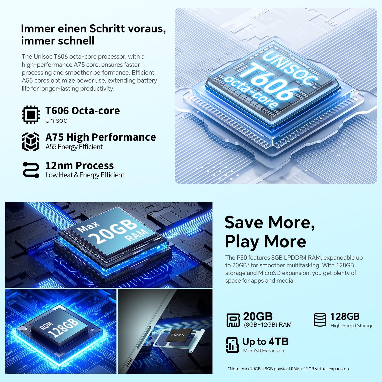 - 🚀【20GB RAM + 128GB ROM + 5TB Erweiterung】Teclast P50 mit 20GB RAM (8GB LPDDR4 + 12GB erweiterbarer Speicher) und 128GB ROM. Micro SD ermöglicht die Speichererweiterung auf bis zu 5TB für ein außergewöhnliches Multitasking-Erlebnis. 128GB Hochgeschwindigkeits-ROM-Speicher zum Speichern großer Spiele und audiovisueller Werke. Das Hören von Musik und das Anschauen von Videos bietet ein intensiveres Erlebnis, als wenn Sie vor Ort wären. Sie können stabile Dienste und Lieblings-Apps genießen.