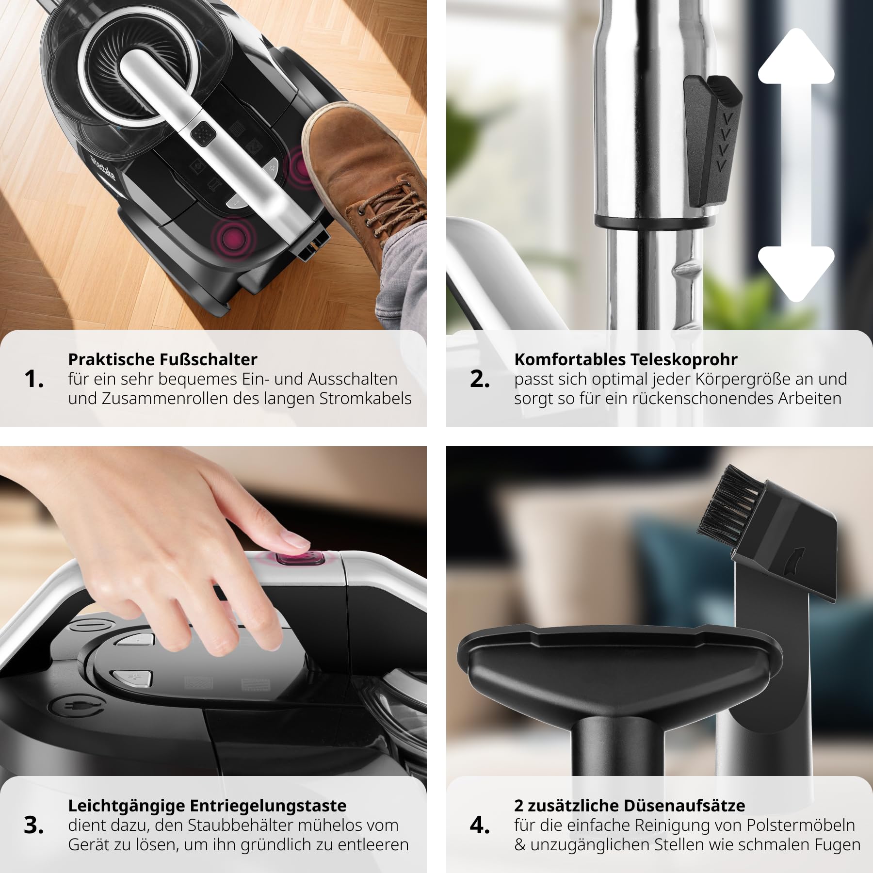 • ANPASSBARE SAUGKRAFT UND PRAKTISCHE BEDIENUNG: Die Saugkraft lässt sich bequem per Knopfdruck anpassen, sodass Du für jede Oberfläche die ideale Reinigungskraft wählen kannst. Zwei große Fußschalter ermöglichen das einfache Ein- und Ausschalten sowie das automatische Aufrollen des Kabels – ohne Bücken! Ein praktisches Feature für komfortables Staubsaugen in Deinem Alltag an unserem Staubsauger mit Kabel.