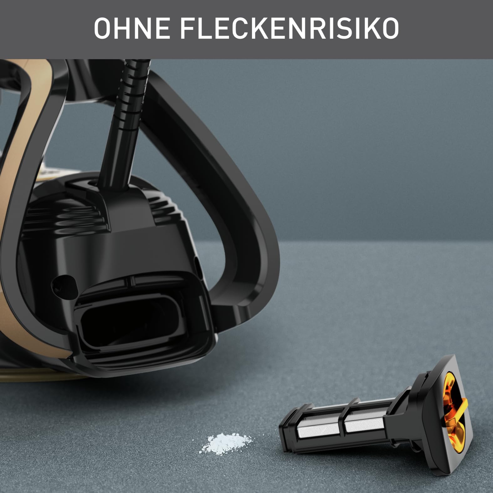 • Patentierter Micro-Calc-Filter: Filtert zu 100% den austretenden Wasserdampf und verhindert so unschöne Kalk-Flecken auf dem Bügelgut; außerdem lässt er sich einfach aus dem Bügeleisen herausnehmen, entleeren und unter fließendem Wasser ausspülen