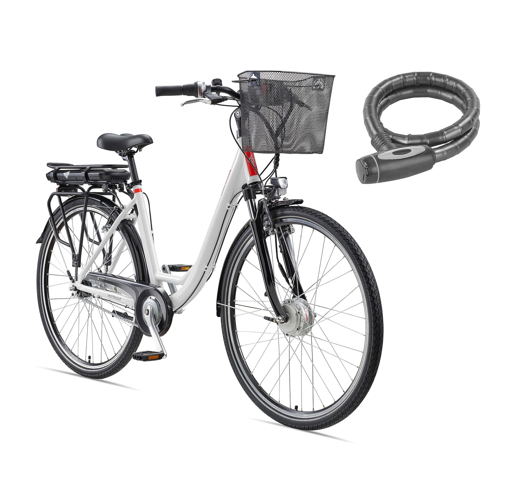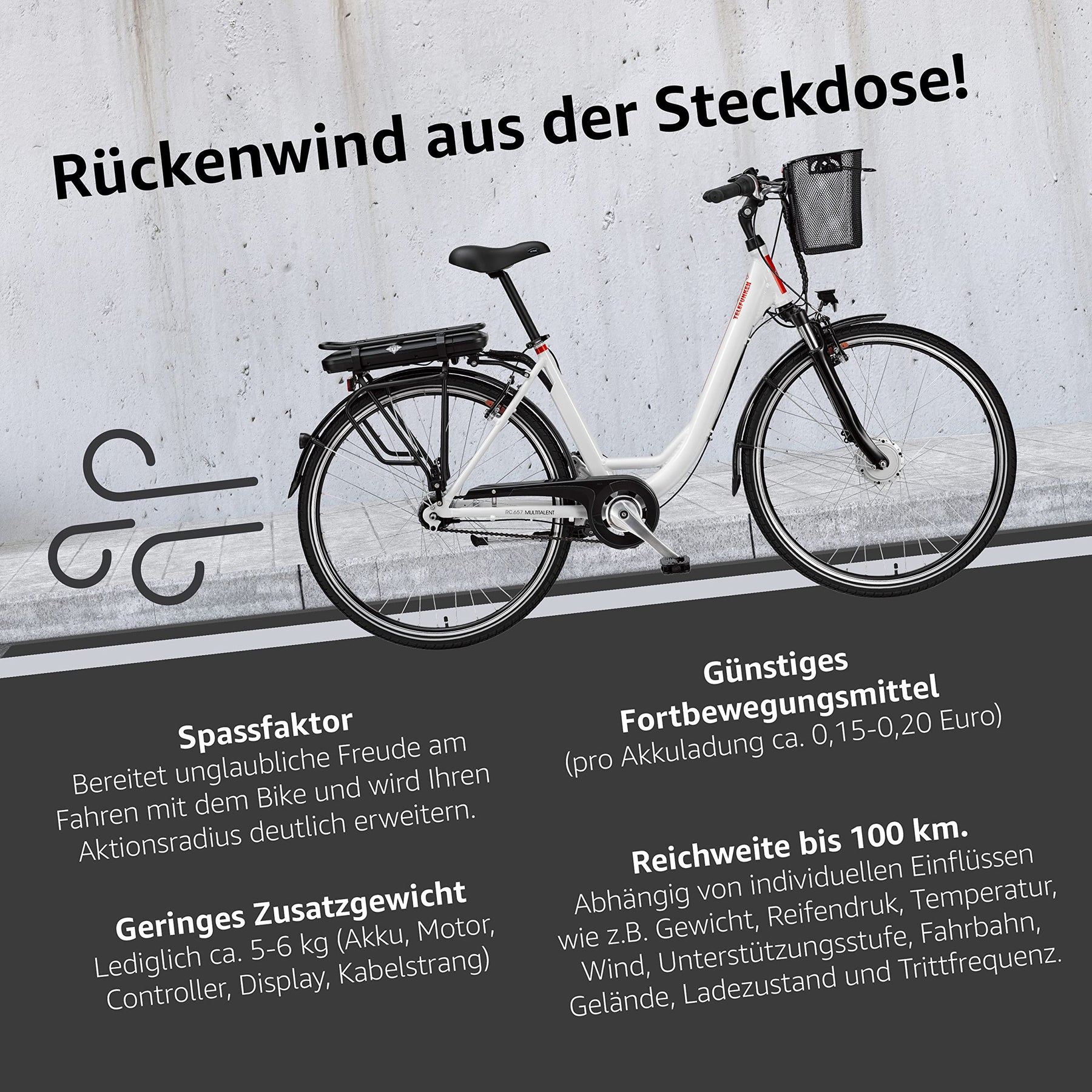 • FEATURES: Kurze Akku-Ladezeit, hochwertiger Telefunken-Motor (wartungsfrei), Fahrradcomputer mit LCD-Display (verstellbar), im Gepäckträger integrierter Akku und LED-Scheinwerfer ohne Dynamo / Das Elektrofahrrad mit tiefem Einstieg in Weiß und zu 98% montiert angeliefert - der Selle Royal Sattel mit Alu-Sattelstütze und der Comfort-Fahrradlenker machen das Rad mit Elektroantrieb bequem
