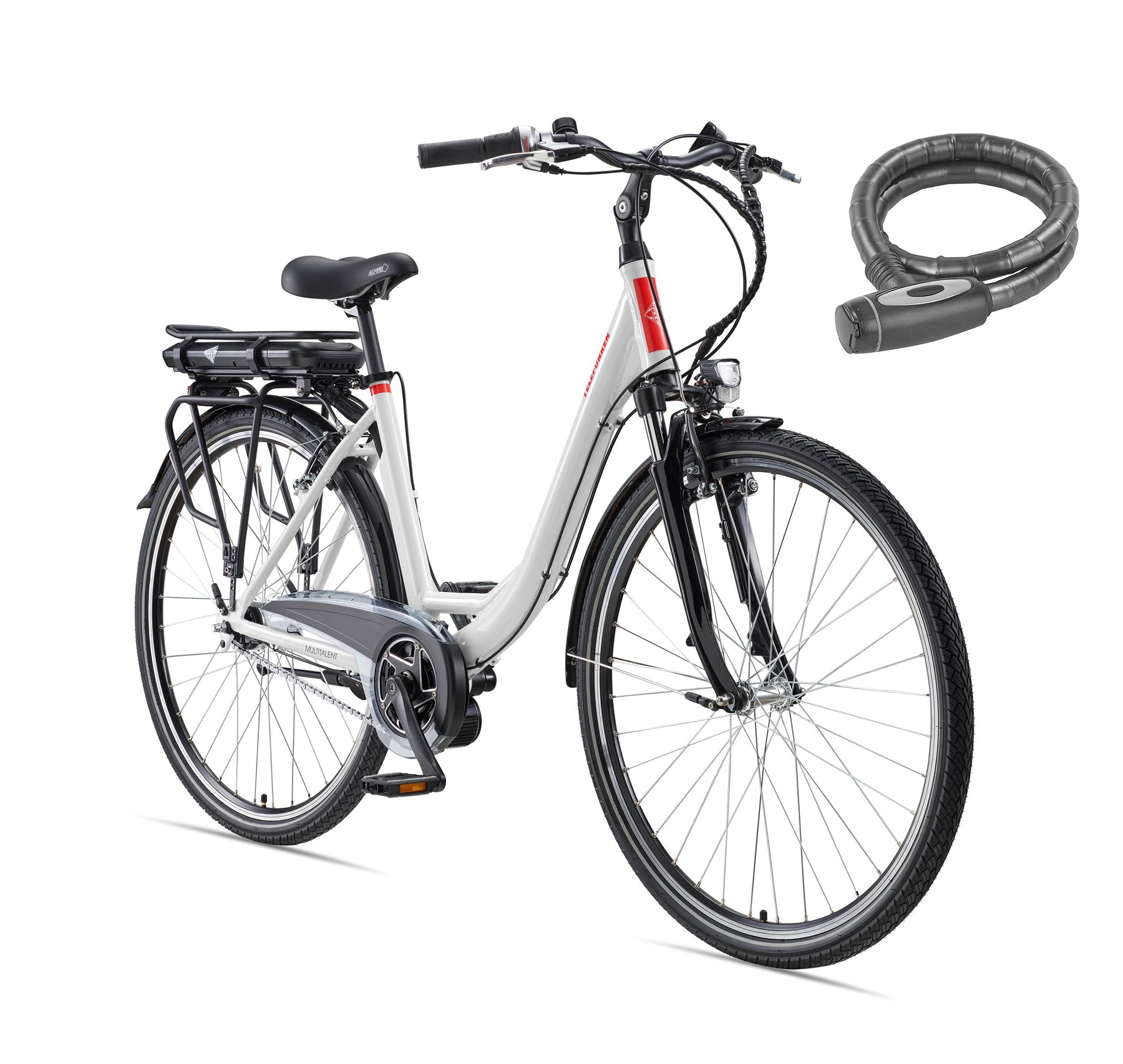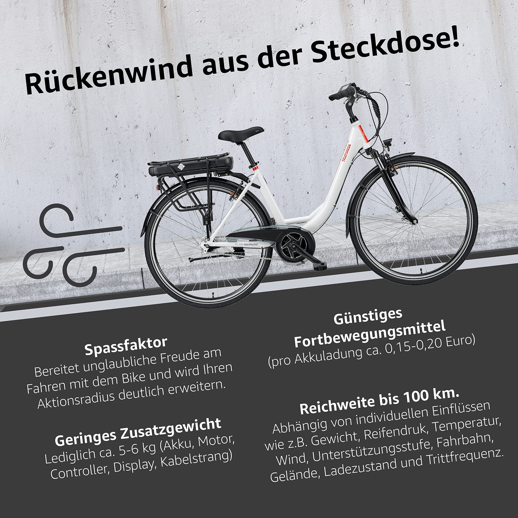 - Sicherheit: Das Ebike ist nicht zulassungspflichtig und bietet die vollständige Ausstattung nach StVZO (LED-Beleuchtung und Reflexbereifung) - V-Bremsen vorne und hinten sorgen für Sicherheit / Dazu enthalten Sie ein diebstahlsicheres Sekura Panzerkabelschloss (Länge: 100 cm, Durchmesser: 2,2 cm, extrem diebstahlsicher)