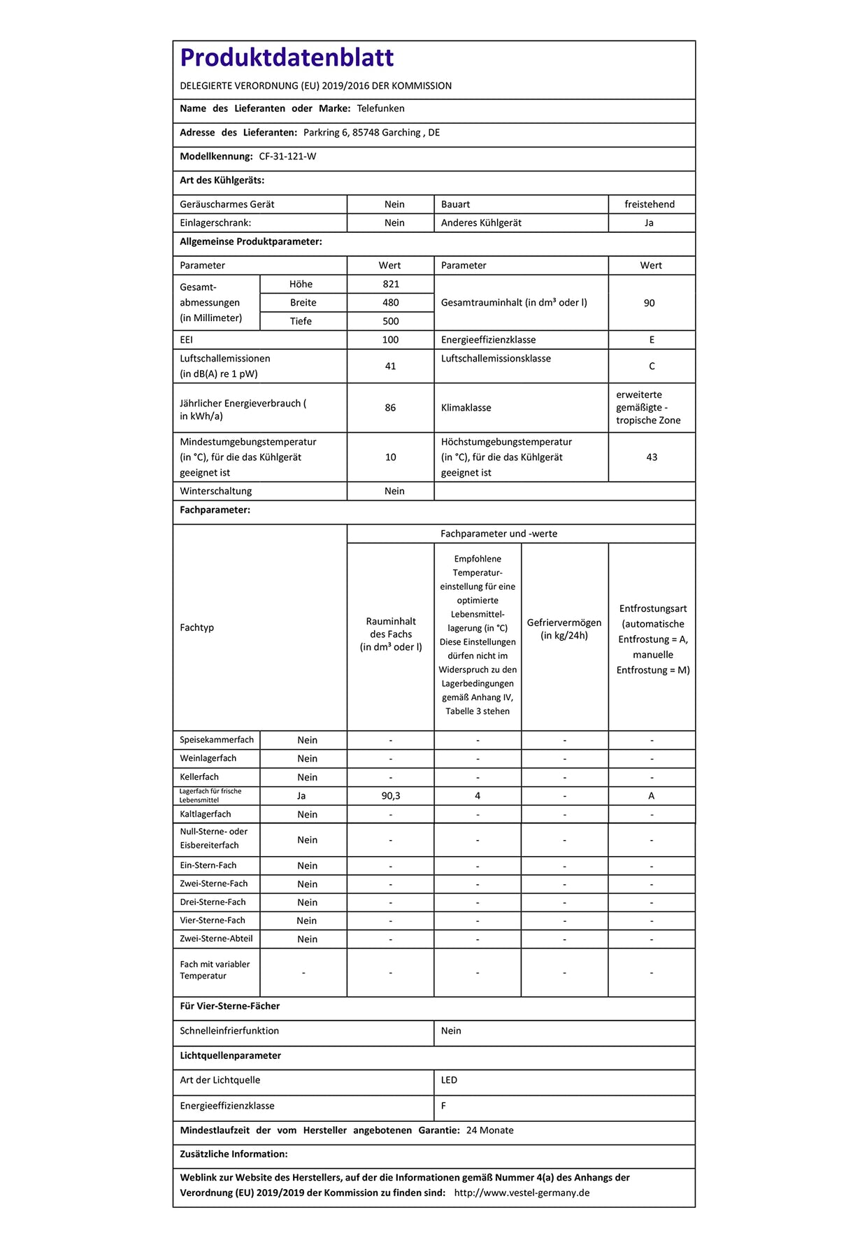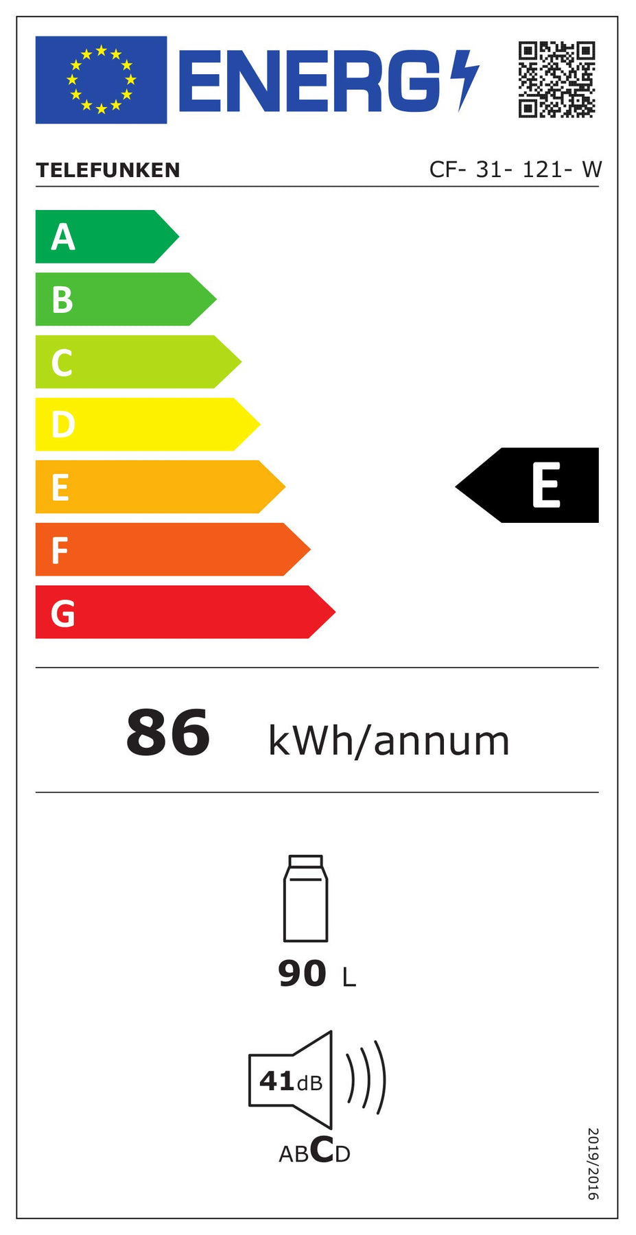 - Energieverbrauch 86 kWh/Jahr - Luftschallemission 41 dB(A) - Klimaklasse T/SN (10°C - 43°C)