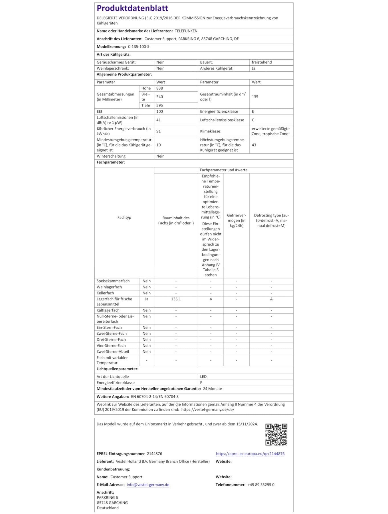 - DETAILS - Energieverbrauch 91 kWh/Jahr | Luftschallemission 41 dB(A) - C | Klimaklasse T/SN (10 - 43°C)