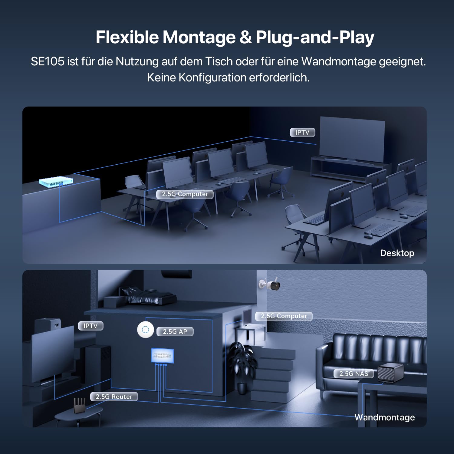 Einzelheiten: Der SE105 bietet 5x 2,5 Gbit/s RJ45-Ports, die an Computer, NAS, IPTV, WIFI7 AP usw. angeschlossen werden können, um den Bedarf an Hochgeschwindigkeits-Internetzugang zu decken. Der SE105 ist ein ideales Netzwerkgerät für den Aufbau von Hochgeschwindigkeits-Netzwerk in kleinen und mittleren Unternehmen, SOHO, Villen oder drahtlosen Netzwerkszenarien.