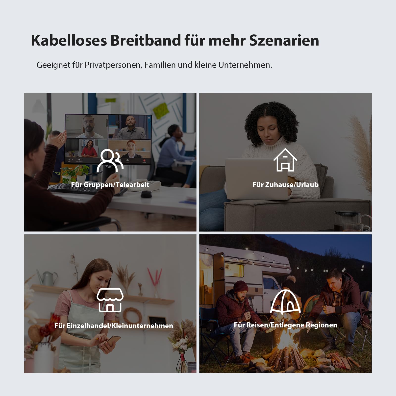 • 【Mehrere Nutzungsszenarien】Kabelloser Breitbandzugang überall, was geeignet für Gruppen/Telearbeit, Heim-/Urlaubsnutzung, Reisen/entlegene Regionen und Einzelhandel/kleine Unternehmen und bietet ein mobiles Netzwerk zur Überwachung; Die Extremtemperatur beträgt -5°C bis 45°C