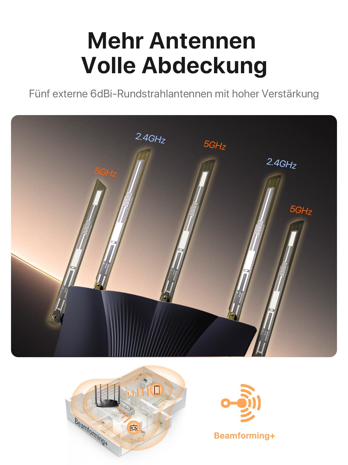 - 【Breite Abdeckung】 5 x 6 dBi Antennen mit hoher Leistung und Richtungsübertragung des Signals Beamforming+ zielen auf die Verbesserung des Signals in Ihrem Standort ab, um die WLAN-Abdeckung und die Signalqualität effizienter zu verbessern und ein starkes und unaufhaltsames Signal zu geben, das durch Wände durchdringt