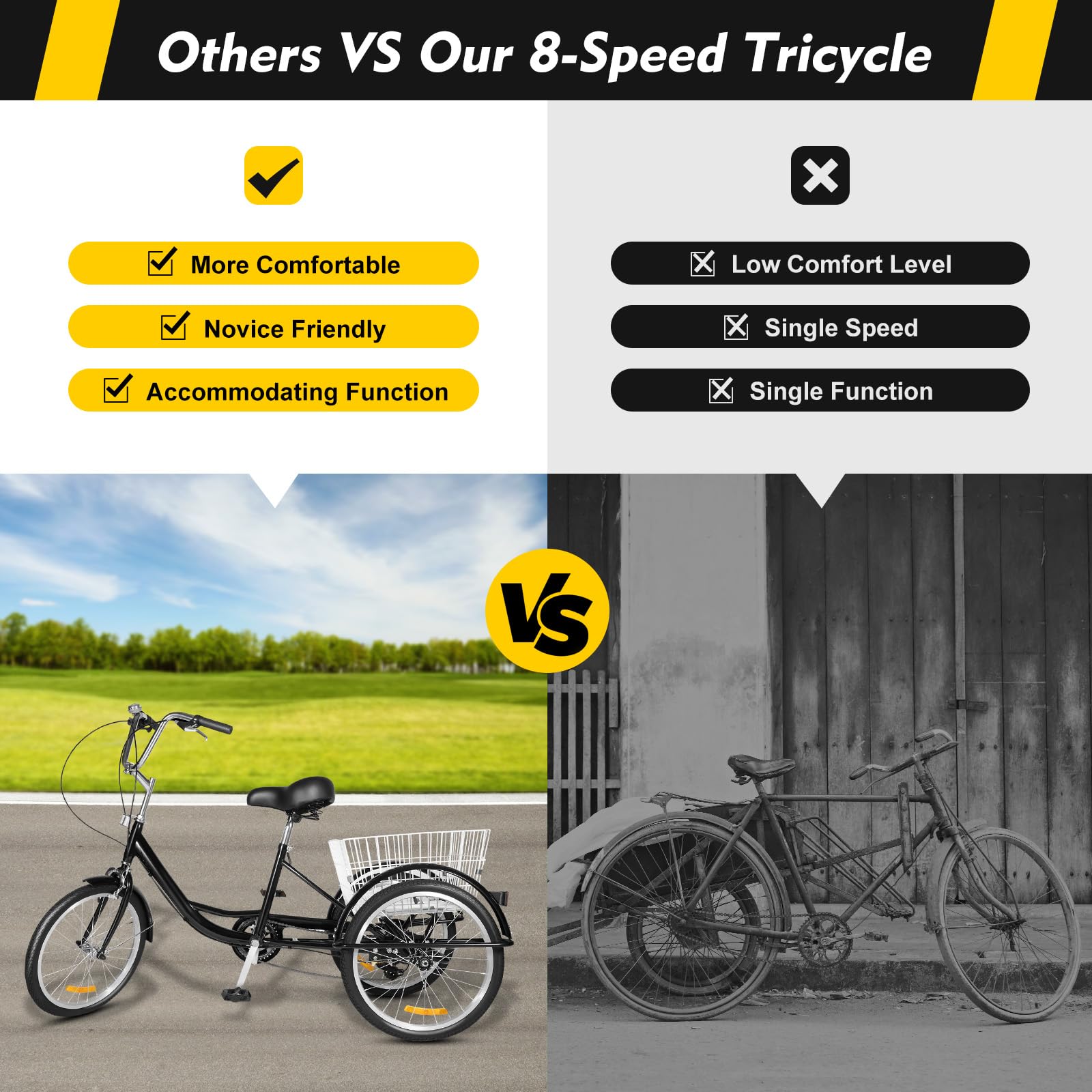 - 【Bequem zu benutzen】Dieses Dreirad ist nicht nur bequem für Sie, um gesund und sicher zu reisen, sondern es hat auch einen faltbaren Korb mit einer Tragfähigkeit von 44.09lbs auf der Rückseite, so dass Sie mehr Dinge nach dem Einkaufen tragen können und es wird nicht zu viel Platz einnehmen.