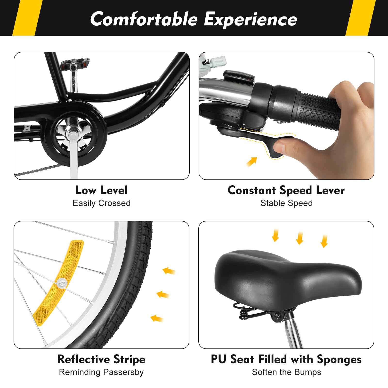 - 【Bequem und sicher】Die rutschfesten Pedale und Griffe, die glatte Kette, der weiche Sitz, die niedrige Stufe, die vorderen und hinteren Bremsen, die für einen stabilen Schwerpunkt sorgen können, das feste Chassis, die dichten Speichen, die Warnglocke und das flexible 3S-Lager können Ihnen nicht nur ein komfortableres Erlebnis bieten, sondern auch Ihre Sicherheit wirksam schützen.