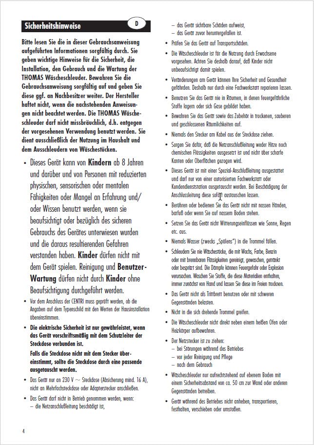 Einzelheiten: Die Wäscheschleuder CENTRI 776 SEK von THOMAS steht für schnelles, wirtschaftliches und umweltschonendes Wäschetrocknen. Bei 2800 Umdrehungen/Minute reduziert sie das Restspülwasser um ca. 40%. Auch Eisen- und Waschmittelrückstände in der Wäsche werden stark verringert. Das schont die Fasern und verlängert die Lebensdauer besonders empfindlicher Textilien. Mit insgesamt 4.5 kg Wäsche kann die THOMAS CENTRI 776 SEK befüllt werden. Bei Baumwollwäsche beträgt die Schleuderdauer 3-5 Minuten. Die Wäscheschleuder ist der ideale Helfer beim Wäschetrocknen in großen wie auch kleinen Haushalten. Mit oder ohne Wäschetrockner. Gründlich, nachhaltig und umweltschonend. MADE IN GERMANY.