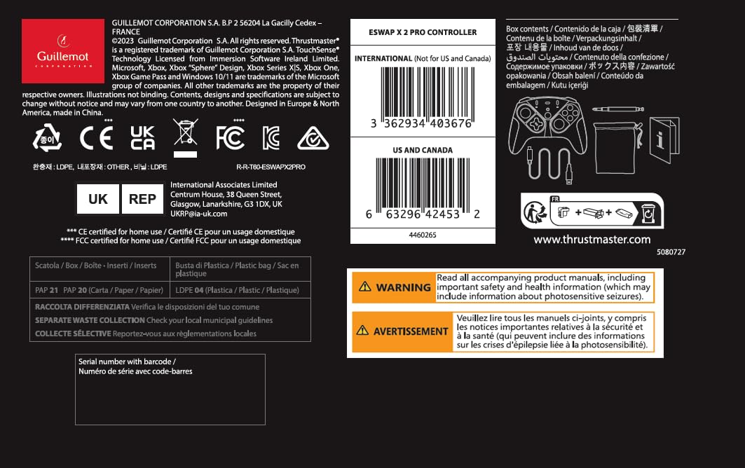 Whats in the box1 1 x ESWAP X 2 PRO CONTROLLER-Gamepad Whats in the box2 2 x austauschbare Mini-Stick-Module Whats in the box3 2 x austauschbare Griffstücke Whats in the box4 2 x austauschbare Trigger Whats in the box5 1 x austauschbares 4-Wege-D-Pad-Modul “D-IPPON" Whats in the box6 2 x Zusatzkappen für Mini-Sticks Whats in the box7 1 x Stromkabel Whats in the box8 1 x Schraubendreher zum Entfernen der Module Whats in the box9 1 x kleiner Aufbewahrungsbeutel für Schraubendreher und Kabel Whats in the box10 Schnellstartanleitung mit Garantieinformationen