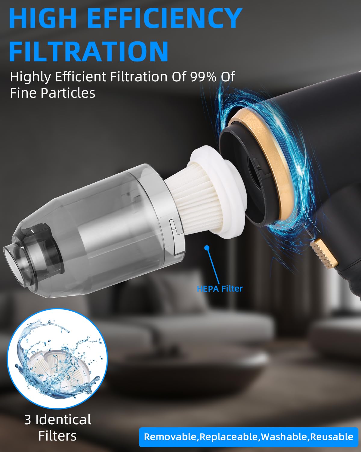 • HOCHEFFIZIENTER FILTER:HEPA-Filter filtert Feinstaub und Verunreinigungen und sammelt sie im Auffangbehälter.Der kabellose Handstaubsauger ist leicht abnehmbar,waschbar und lufttrocknend und ermöglicht so ein müheloses Reinigungserlebnis