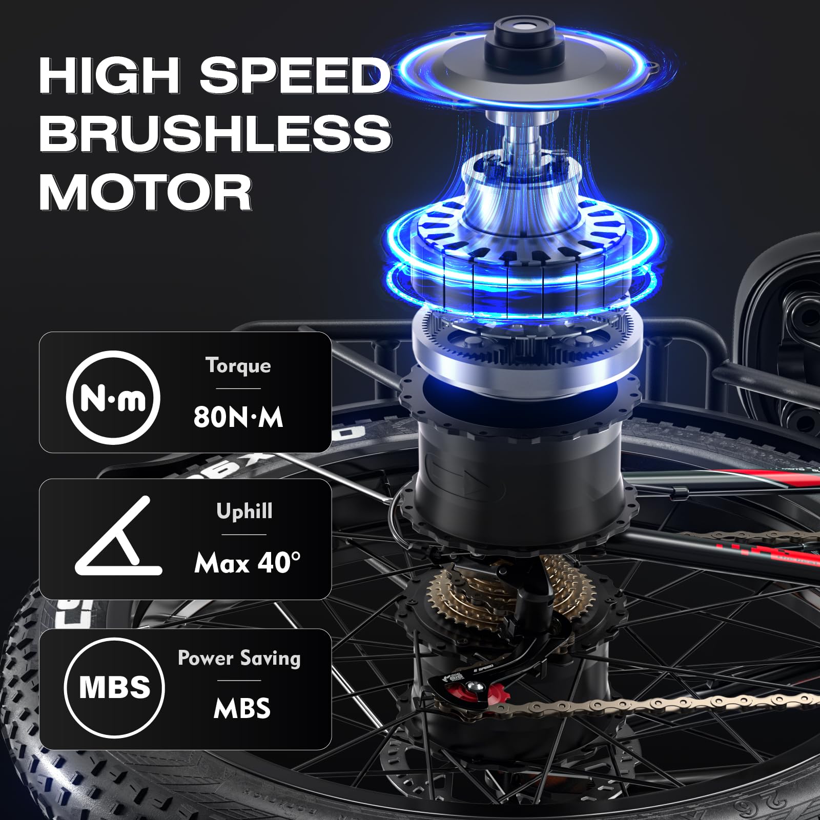 - (Bürstenloser Hochfrequenzmotor) Das 26-Zoll-Elektrofahrrad für Erwachsene ist mit einem leistungsstarken bürstenlosen Hochgeschwindigkeitsmotor mit einem enormen Drehmoment von 80 N·M ausgestattet, mit dem Sie alle Arten von unebenem Gelände problemlos bewältigen können.