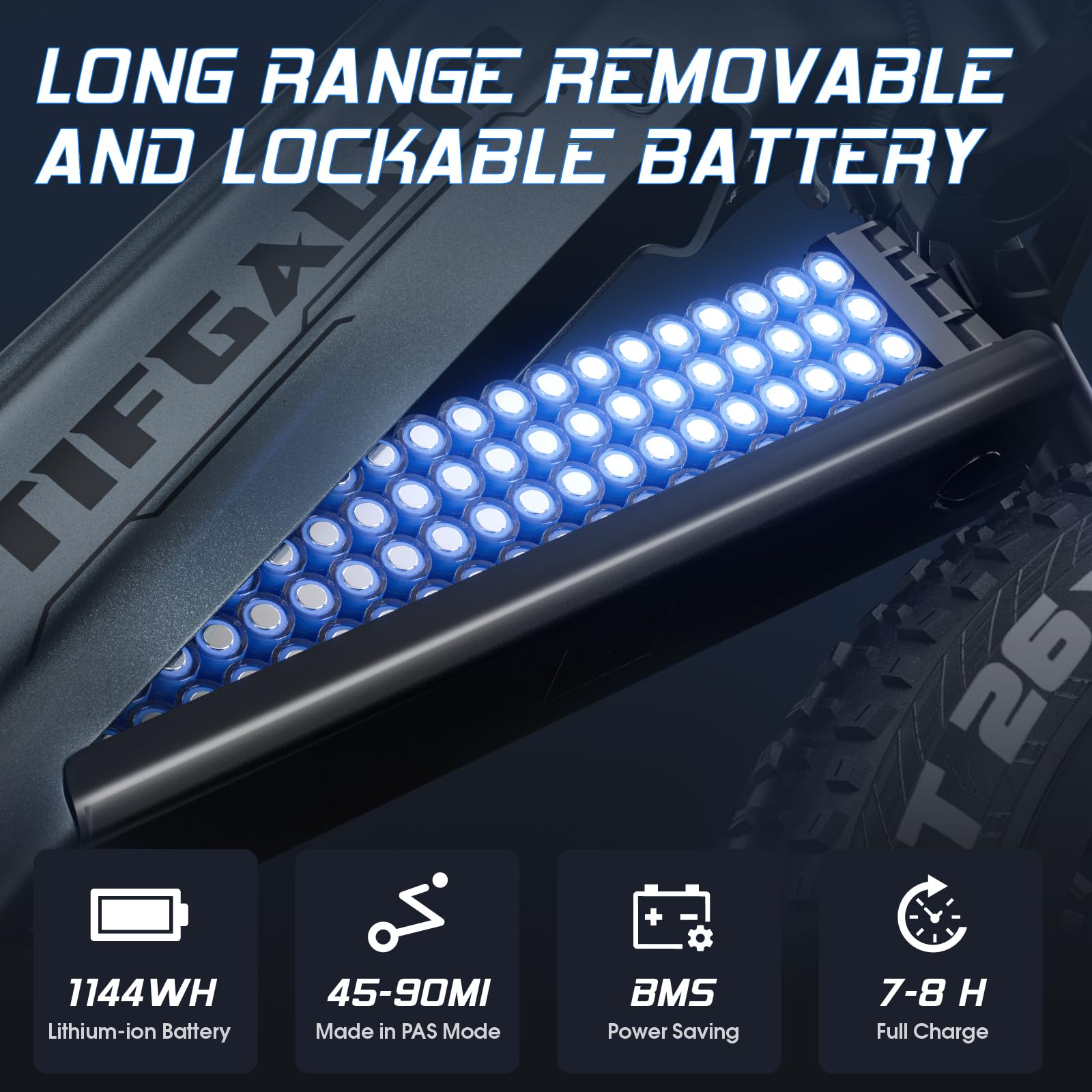 - (Akku) Das Elektrofahrrad verfügt über einen leistungsstarken herausnehmbaren 48V 18Ah-Lithiumakku mit hoher Energiekapazität, der eine Reichweite von bis zu 90 Kilometern ermöglicht (Reichweite abhängig vom Pedalassist-Modus oder reinem Elektromodus).