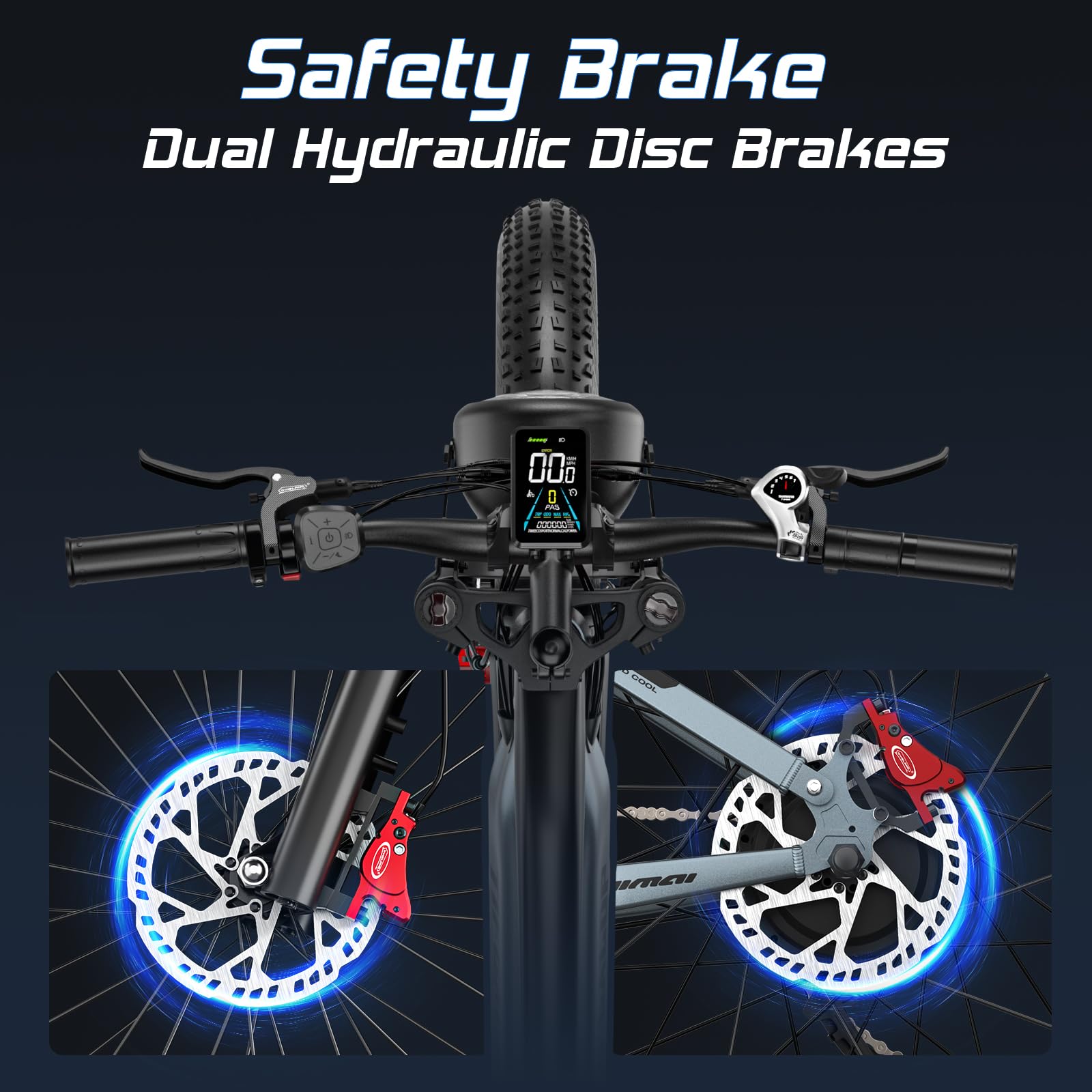 - (Reifen) Das Offroad-Elektrofahrrad verfügt über professionelle 26-Zoll-All-Terrain-Reifen, die auch anspruchsvollste Gelände wie Berge, Schotterwege oder Geröllmeile meister können. In Kombination mit hydraulischen Scheibenbremsen garantieren diese Reifen sicheres, stabiles und schnelles Bremsen – auch bei hoher Geschwindigkeit oder rutschigen Bedingungen.