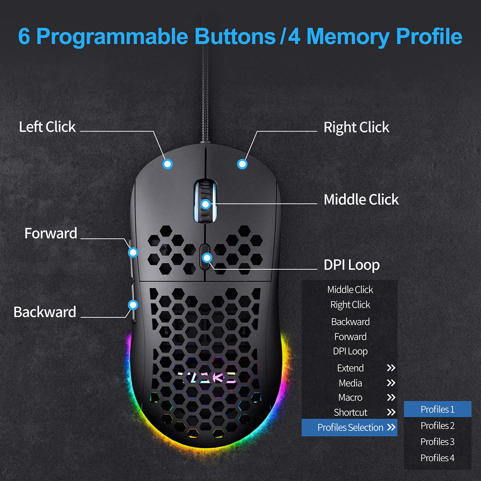 TMKB M1se Gaming Maus mit 12800 DPI Optischer Sensor,6 Programmierbare Tasten Wabenmaus,Anpassbares RGB Computer Mouse,Schleppfreies Paracord,Ergonomische für Windows PC MAC-Schwarz