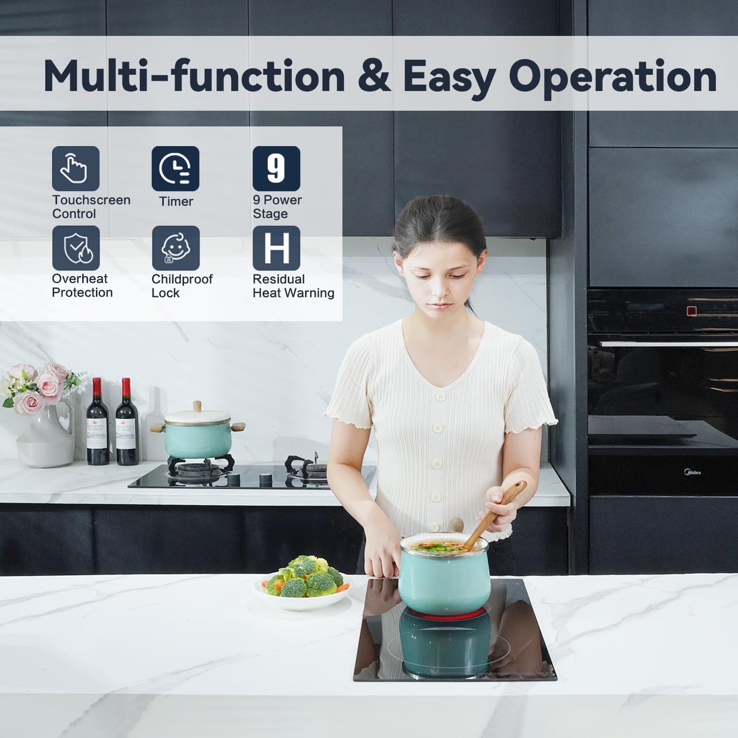 • 🥦2 Brenner: Dieses Glaskeramikkochfeld ist mit 2 Brennern ausgestattet. Die Leistung der 2 Brenner beträgt 1200 W (165 mm),1800 W (200 mm). Sie können 2 Gerichte gleichzeitig zubereiten und so Kochzeit sparen. Das Keramikkochfeld verfügt außerdem über 9 einstellbare Gänge. Sie können verschiedene Gänge an verschiedenen Brennern einstellen, indem Sie einfach die "+/-"-Taste mit den Fingerspitzen berühren. Einfach zu verwenden