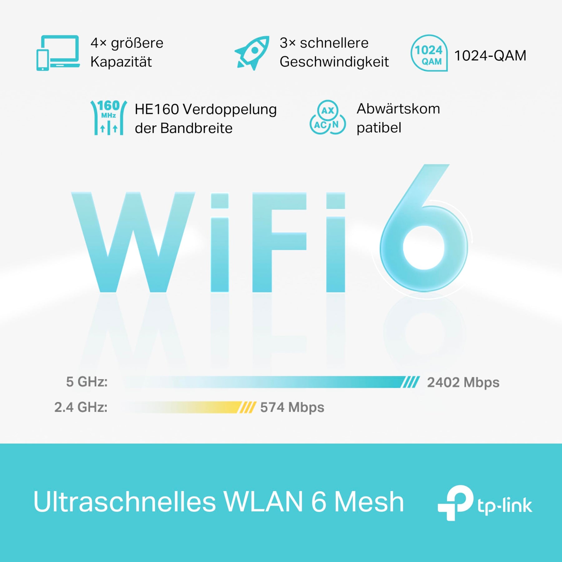 • Hohe Geschwindigkeit und mehr Verbindung mit Wi-Fi 6 Mesh: Geschwindigkeit bis zu 3000 Mbit/s, 2402 Mbit/s bei 5 GHz und 574 Mbit/s bei 2,4 GHz. Verbinden Sie mehr als 150 Geräte gleichzeitig mit weniger Verzögerung, sodass Sie reaktionsschnelleres Gaming oder 8K-Streaming genießen können, wenn mehrere Geräte gleichzeitig Daten übertragen