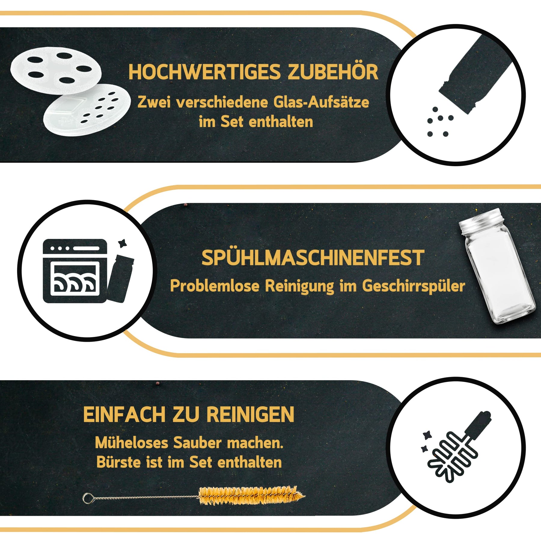 • HYGIENISCH UND LEBENSMITTELECHT - Unsere Gewürzgläser bestehen aus hochwertigem Glas, sind BPA-frei und lebensmittelecht. Dadurch bleibt das Aroma Deiner Gewürze und Kräuter frisch. Optimale Gewürzaufbewahrung