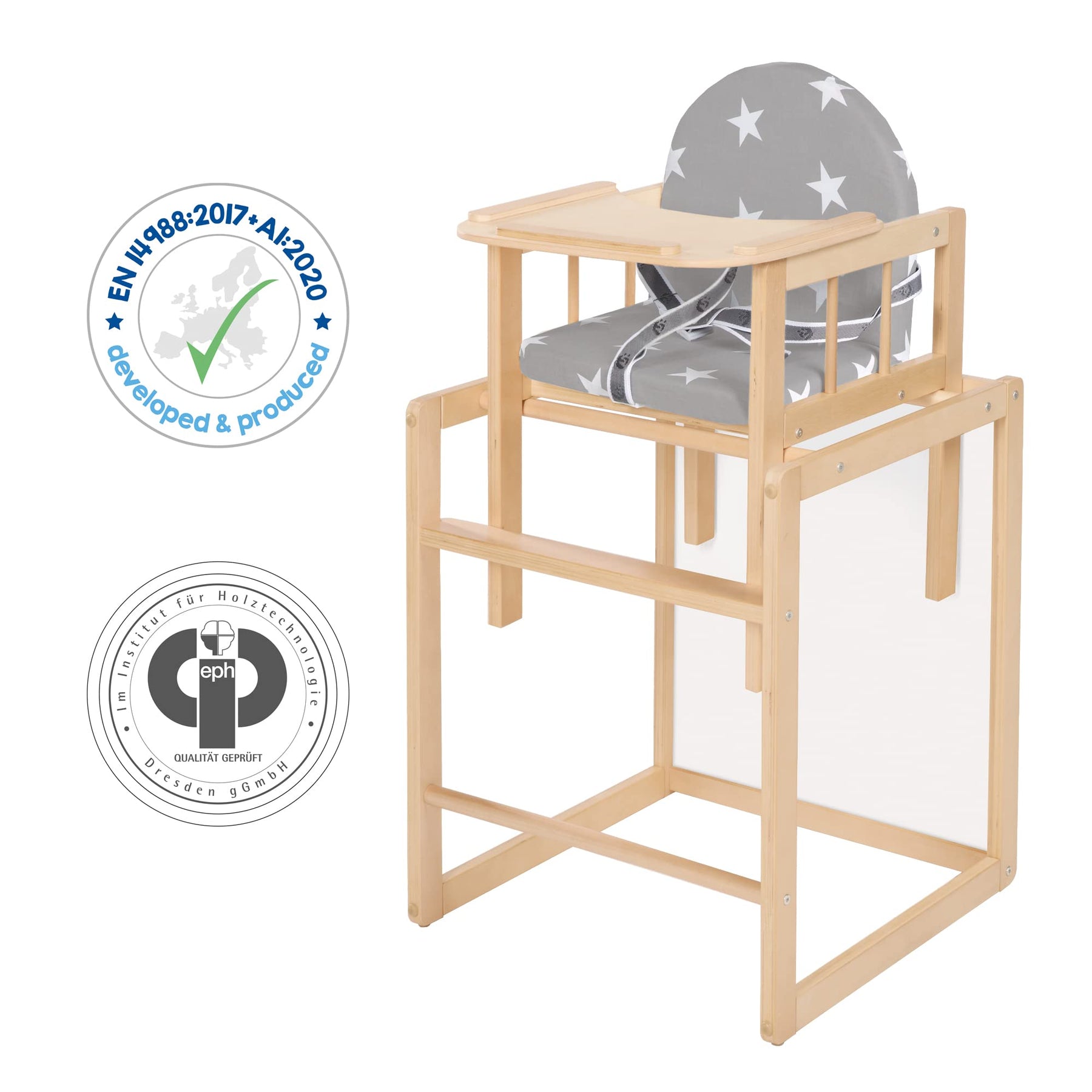 Einzelheiten: Der roba Kombi-Hochstuhl ist ein sicherer und flexibler Hochstuhl der sich mit wenigen Handgriffen in eine Tisch-Stuhl-Kombination verwandeln lässt. Gesamthöhe: 88cm, Tischmaß: 54 x 46 x 44 cm, Sitzhöhe: 27 cm (Einzelstuhl) / 58 cm (aufgesetzt). Die weiche Sitz- und Rückenpolsterung sowie das stufenlos verstellbare und abnehmbare Holzessbrett des Kinderhochstuhles garantieren bequemen Sitzkomfort für Ihren Schützling. Das Polster des Stuhls ist mit abwaschbarer Folie bezogen, frei von gesundheitsschädlichen Phthalaten und damit hautfreundlich und besonders pflegeleicht auch bei anspruchsvollen Verschmutzungen. Der stabile Babystuhl aus buchefarbenem Holz hat durch seine spezielle Konstruktion eine hohe Kippsicherheit. Das Gurtesystem bietet zusätzlichen Schutz im Kleinkindalter. Der Baby- und Kinderhochstuhl ist ab ca. 6 Monate verwendbar. Die Tisch-Stuhl-Kombination wird zerlegt geliefert. Die einfache Montage des Kinderstuhls dauert ca. 30 Min. Der Stuhl wurde nach der aktuellsten Sicherheitsnorm DIN EN 14988-1+2:2006+A1:2012 in Deutschland entwickelt. Alle verwendeten Materialien sind schadstoffgeprüft und zertifiziert. Zusätzlich trägt der Stuhl das EPH Qualitätssiegel des Institutes für Holztechnologie. Der verwendete Lack ist lebensmittelecht und hautverträglich. Alle Oberflächen sind abwischbar und pflegeleicht. Der Holzhochstuhl ist in weiß und natur mit verschiedenen Designs für den gepolsterten Sitz in Folie oder PU-beschichtetem Stoff erhältlich. Damit auch kleinere Babys perfekt in dem Kombihochstuhl sitzen können, empfehlen wir als Zubehör den passenden Sitzverkleinerer.